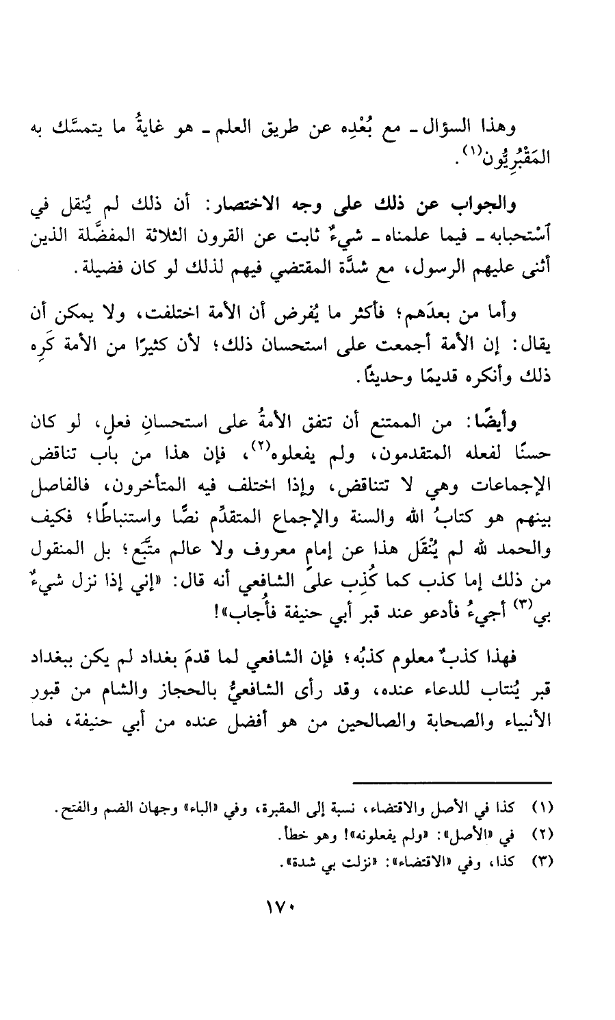 وأيضا من الممتنع أن تتفق الأمة على استحسان فعل لو كان حسنا لفعله المتقدمون ولم يفعلوه، فإن هذا من باب تناقض الإجماعات، وهي لا تتناقض، وإذا اختلف فيه المتأخرون، فالفاصل بينهم هو كتاب الله، والسنة، والإجماع المتقدم نصا واستنباطا، فكيف - والحمد لله - لم ينقل هذا عن إمام معروف ولا عالم متبع؟ بل المنقول من ذلك إما كذب، كما كذب على الشافعي أنه قال: "إني إذا نزل شيء بي أجيء فأدعو عند قبر أبي حنيفة فأجاب" فهذا كذب معلوم فإن الشافعي لما قدم بغداد لم يكن ببغداد قبر ينتاب للدعاء عنده، وقد رأى الشافعي بالحجاز والشام من قبور الأنبياء والصحابة والصالحين من هو أفضل عنده من أبي حنيفة، فما