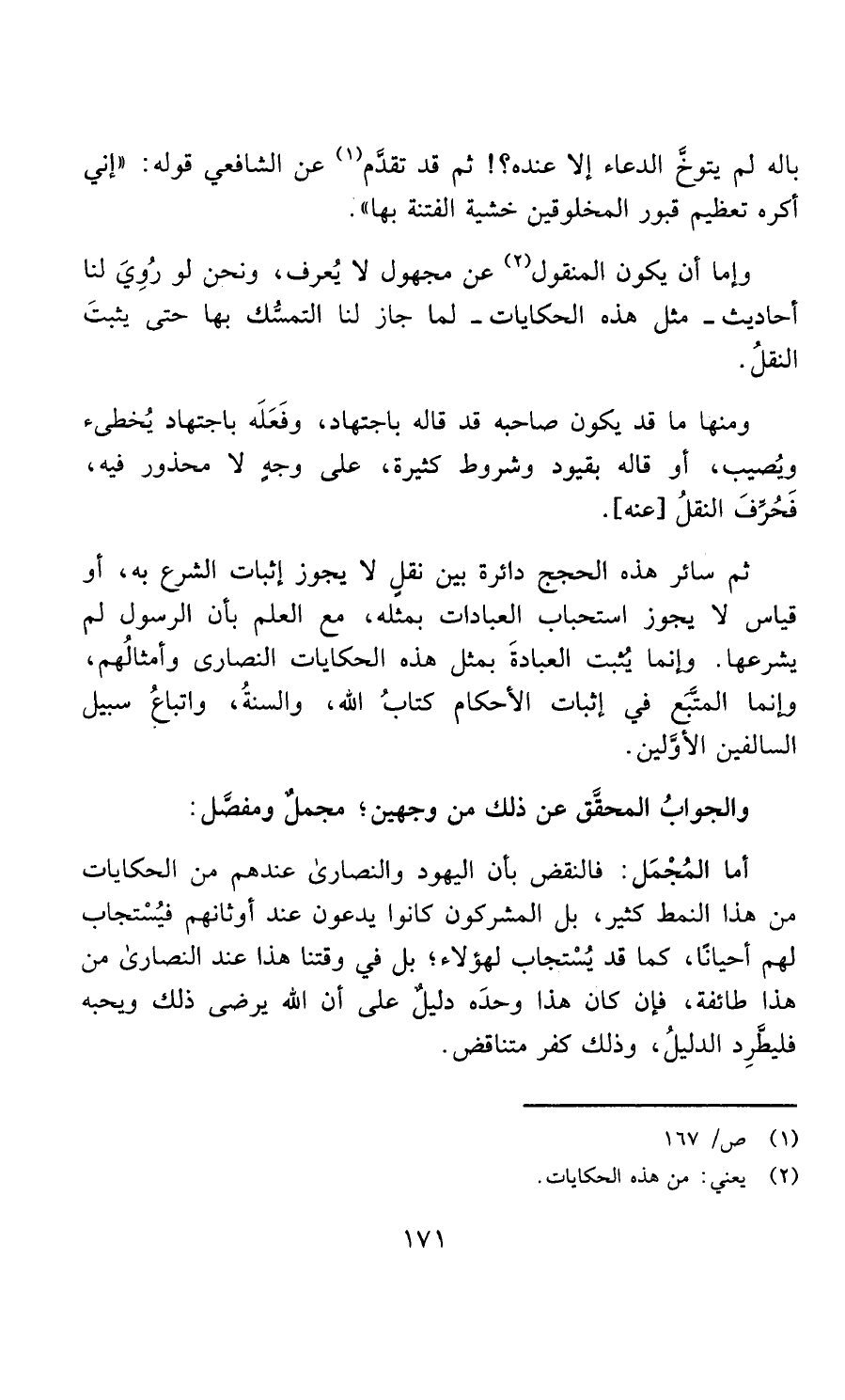 ومنها ما قد يكون صاحبه قد قاله باجتهاد أو فعله باجتهاد يخطئ ويصيب، أو قاله بقيود وشروط كثيرة على وجه لا محذور فيه، فحرف النقل عنه، ثم سائر هذه الحجج دائر بين نقل لا يجوز إثبات الشرع به أو قياس لا يجوز استحباب العبادات بمثله، مع العلم بأن الرسول لم يشرعها، وإنما تثبت العبادات بمثل هذه الحكايات النصارى وأمثالهم، وإنما المتبع في إثبات الأحكام كتاب الله والسنة واتباع سبيل السالفين الأولين.