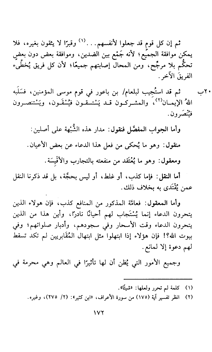 ثم إن كل قوم قد جعلوا لأنفسهم شخصا أو قبرا لا يثقون بغيره، فلا يمكن موافقة الجميع؛ لأنه جمع بين الضدين، وموافقة بعض دون بعض تحكم بلا مرجح، ومن المحال إصابتهم جميعا؛ لأن كل فريق يخطئ الفريق الآخر، ثم قد استجيب لبلعام بن باعوراء في قوم موسى المؤمنين، فسلبه الله الإيمان، والمشركون قد يستسقون فيسقون، ويستنصرون فينصرون.