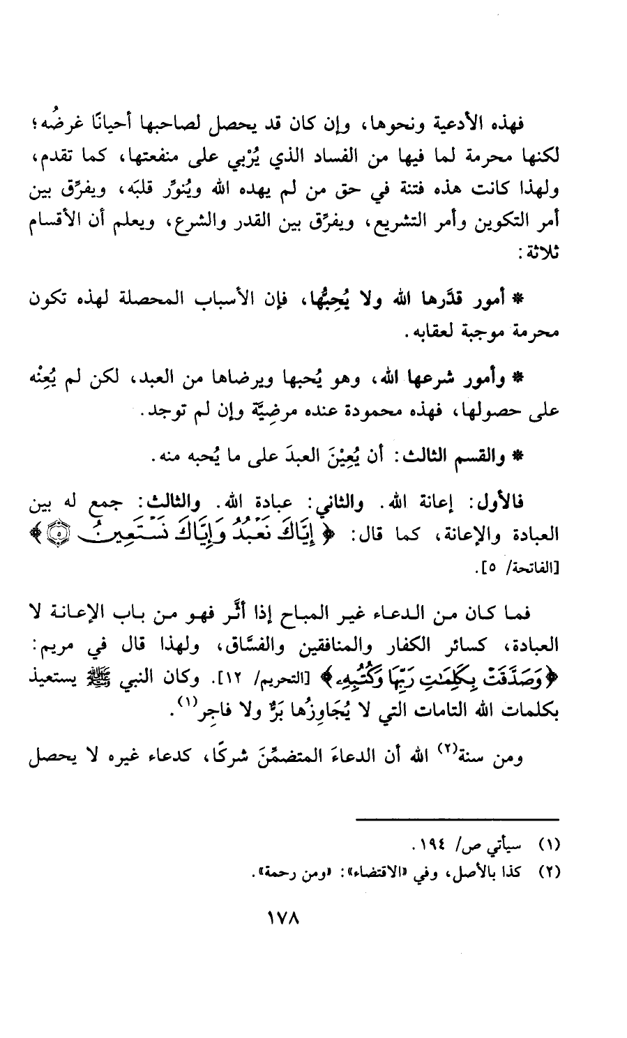 فالأول إعانة الله، والثاني عبادة الله، والثالث جمع له بين العبادة والإعانة، كما قال: إِيَّاكَ نَعْبُدُ وَإِيَّاكَ نَسْتَعِينُ فما كان من الدعاء غير المباح إذا أثر فهو من باب الإعانة لا العبادة كدعاء سائر الكفار والمنافقين والفساق، ولهذا قال في مريم: وَصَدَّقَتْ بِكَلِمَاتِ رَبِّهَا وَكُتُبِهِ وكان النبي صلى الله عليه وسلم يستعيذ بكلمات الله التامات التي لا يجاوزها بر ولا فاجر.