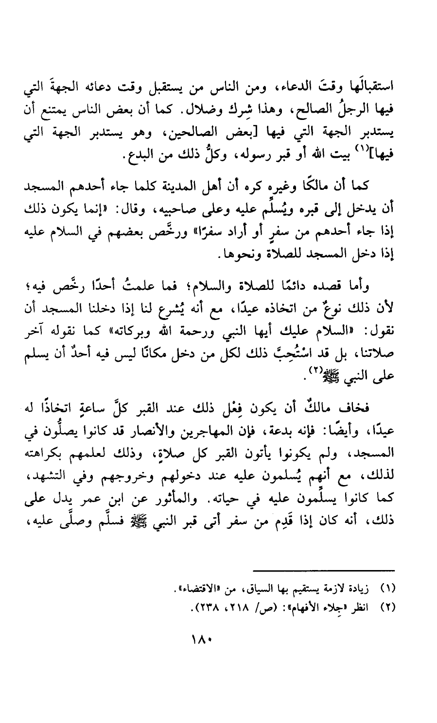استقبالها وقت الدعاء، ومن الناس من يستقبل وقت دعائه الجهة التي فيها الرجل الصالح، وهذا شرك وضلال، كما أن بعض الناس يمتنع أن يستدبر الجهة التي فيها [بعض مقدسيهم من الصالحين] وهو يستدبر الجهة التي فيها بيت الله وقبر رسول الله صلى الله عليه وسلم وكل ذلك من البدع.