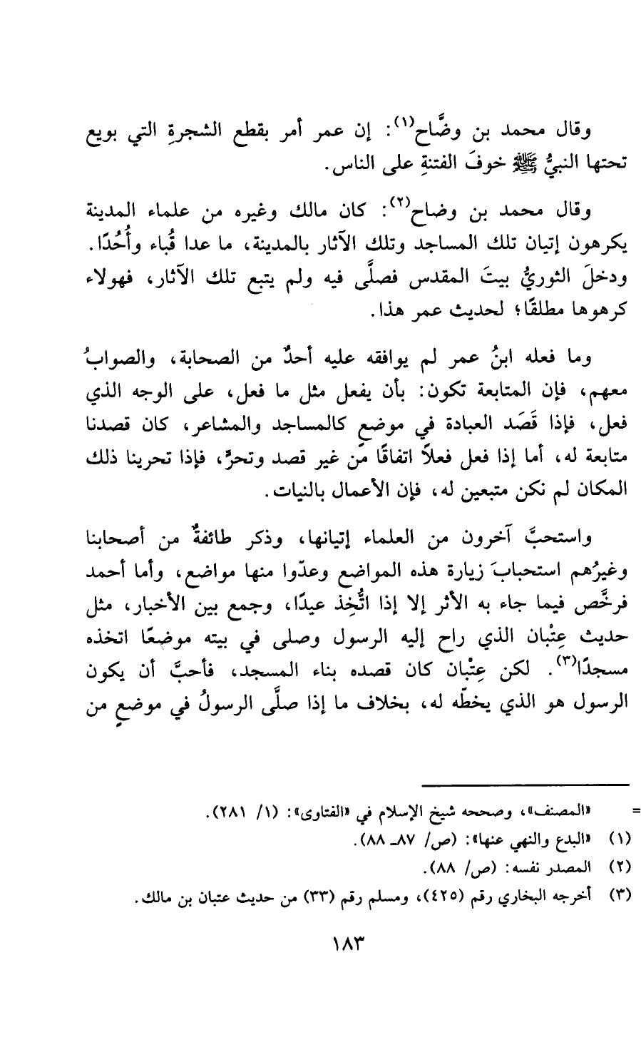 وقال محمد بن وضاح: كان مالك وغيره من علماء المدينة يكرهون إتيان تلك المساجد وتلك الآثار بالمدينة ما عدا قباء وأحدا، ودخل الثوري بيت المقدس، وصلى فيه، ولم يتبع تلك الآثار فهؤلاء كرهوها مطلقا؛ لحديث عمر هذا.