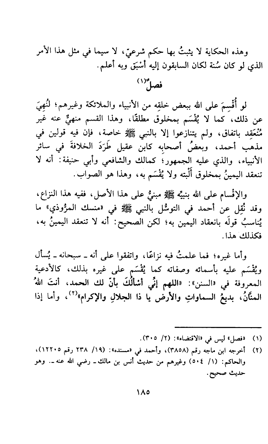 فصل ذكر حرمة الإقسام على الله ببعض خلقه من الأنبياء والملائكة وغيرهم