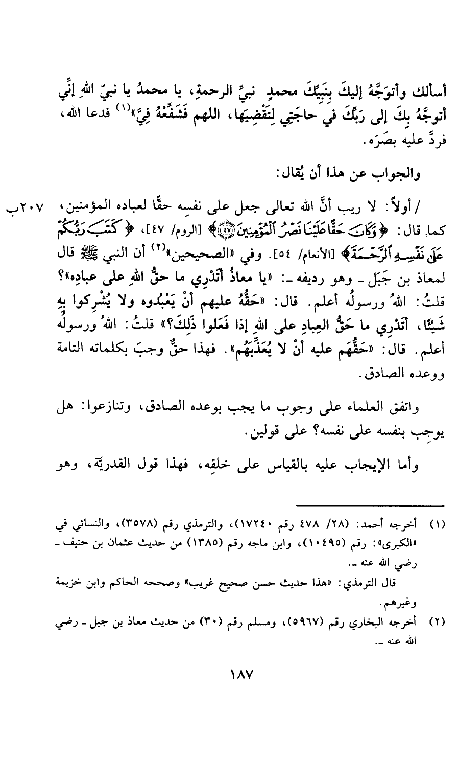 وفي الصحيحين أن النبي صلى الله عليه وسلم قال لمعاذ بن جبل - وهو رديفه -: "يا معاذ أتدري ما حق الله على عباده"؟. قلت: الله ورسوله أعلم. قال: "حقه عليهم أن يعبدوه ولا يشركوا به شيئا. أتدري ما حق العباد على الله إذا فعلوا ذلك؟ ". قلت: الله ورسوله أعلم. قال: "حقهم عليه أن لا يعذبهم".