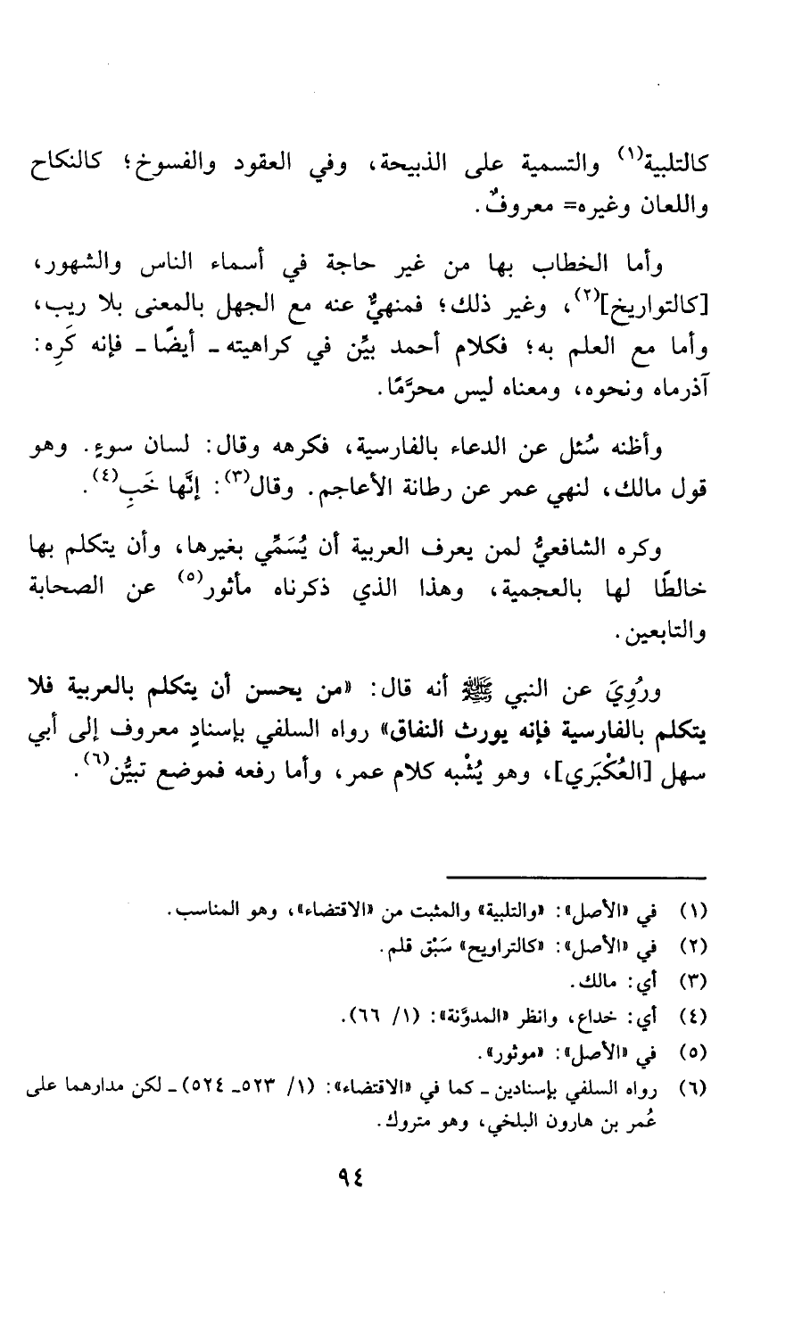 وكره الشافعي لمن يعرف العربية أن يسمى بغيرها وأن يتكلم بها خالطا لها بالعجمية، وهذا الذي ذكرناه مأثور عن الصحابة.