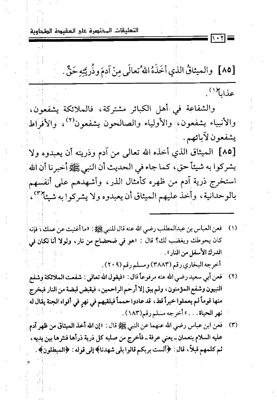 (¬3) فعن ابن عباس رضي الله عنهما عن النبي صلى الله عليه وسلم قال: "إن الله أخذ الميثاق من ظهر آدم عليه السلام بنعمان -يعني عرفة- فأخرج من صلبه كل ذرية ذرأها فنثرها بين يديه، ثم كلمهم قبلاً، قال: (ألست بربكم قالوا بلى شهدنا) إلى قوله: (المبطلون) .