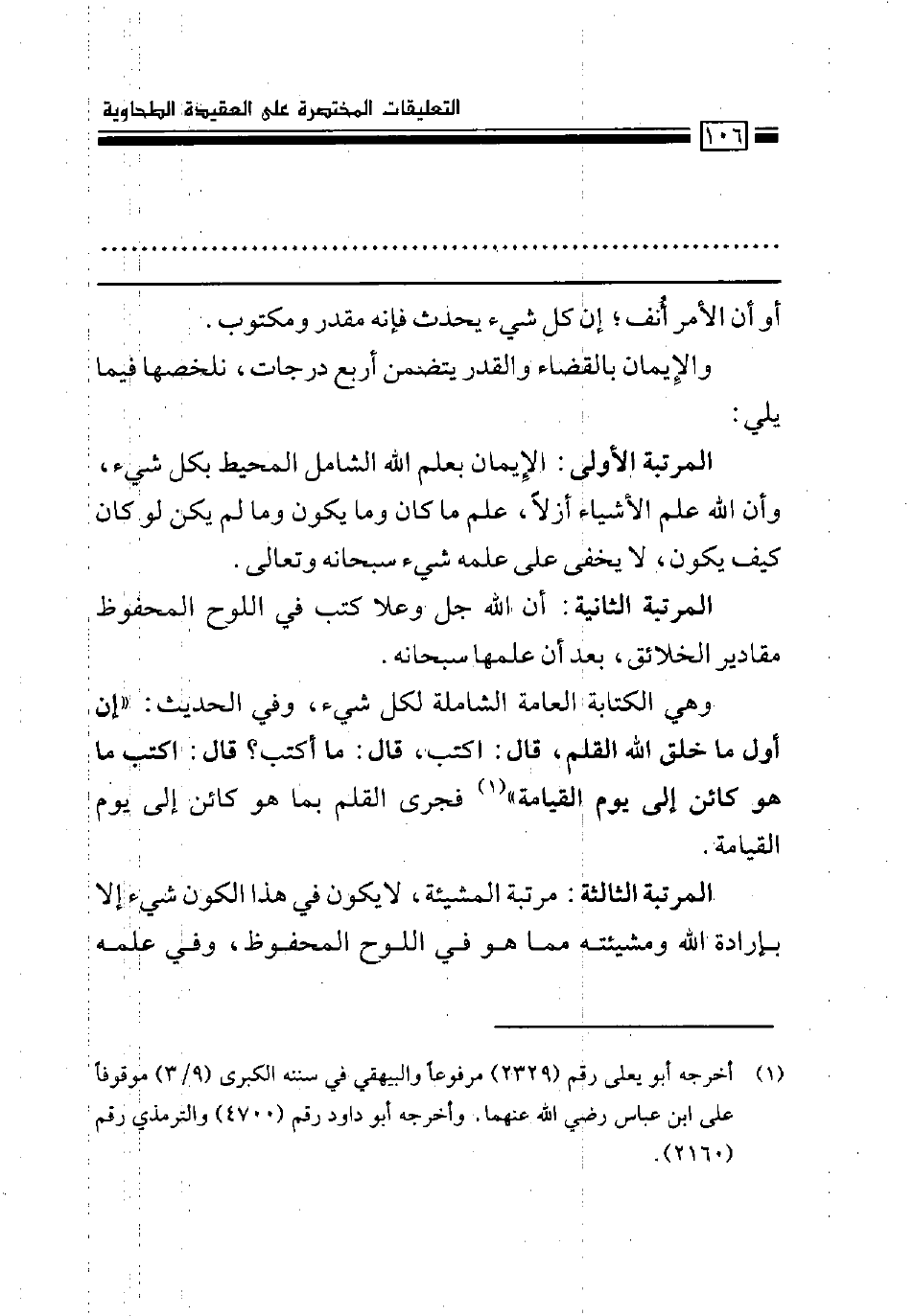 المرتبة الثالثة: مرتبة المشيئة، لا يكون في هذا الكون شيء إلا بإرادة الله ومشيئته مما هو في اللوح المحفوظ، وفي علمه