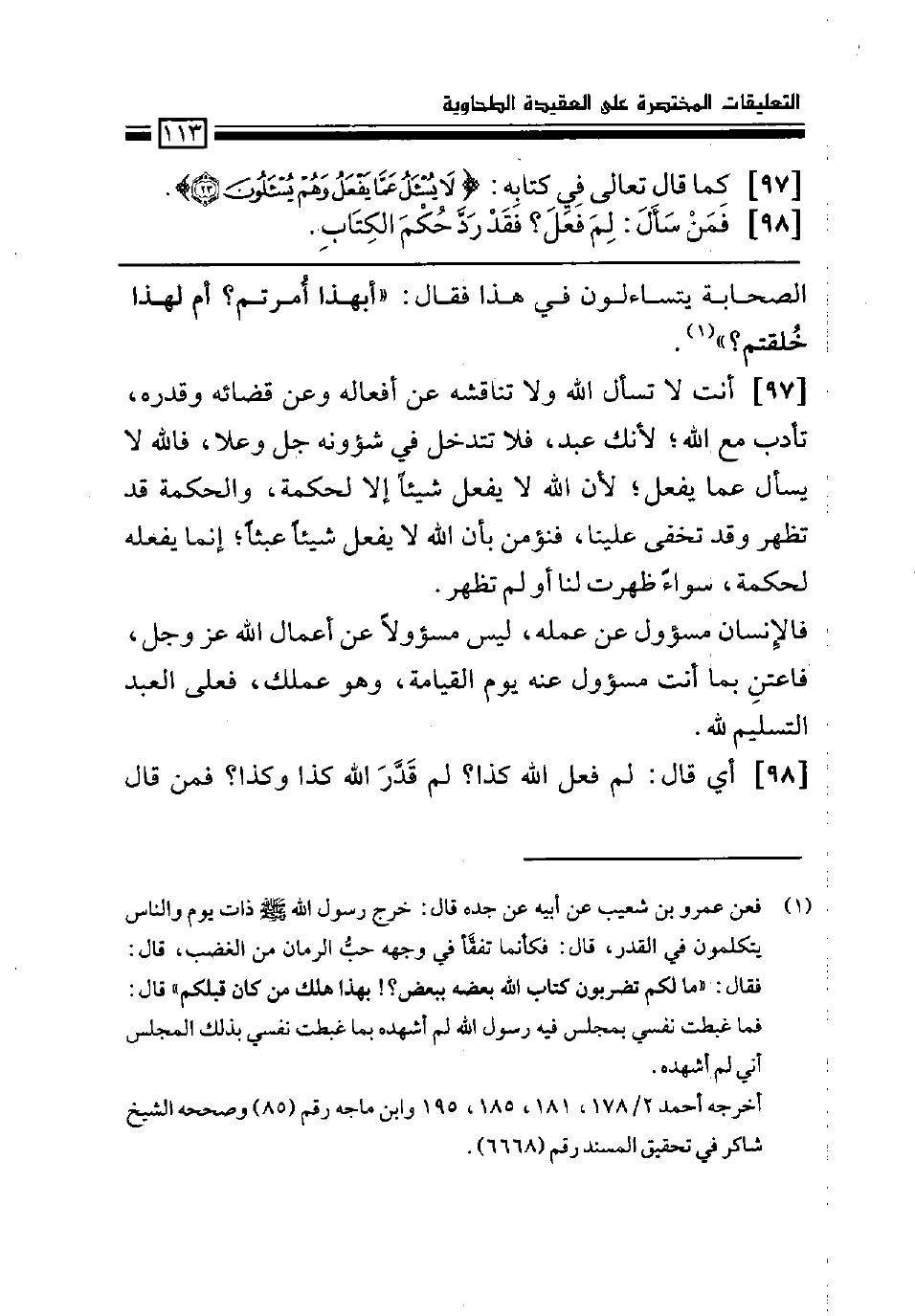 (¬1) فعن عمرو بن شعيب عن أبيه عن جده قال: خرج رسول الله صلى الله عليه وسلم ذات يوم والناس يتكلمون في القدر، قال: فكأنما تفقَّأ في وجهه حبُّ الرمان من الغضب، قال: فقال: "ما لكم تضربون كتاب الله بعضه ببعض؟! بهذا هلك من كان قبلكم" قال: فما غبطت نفسي بمجلس فيه رسول الله لم أشهده بما غبطت نفسي بذلك المجلس أني لم أشهده.
