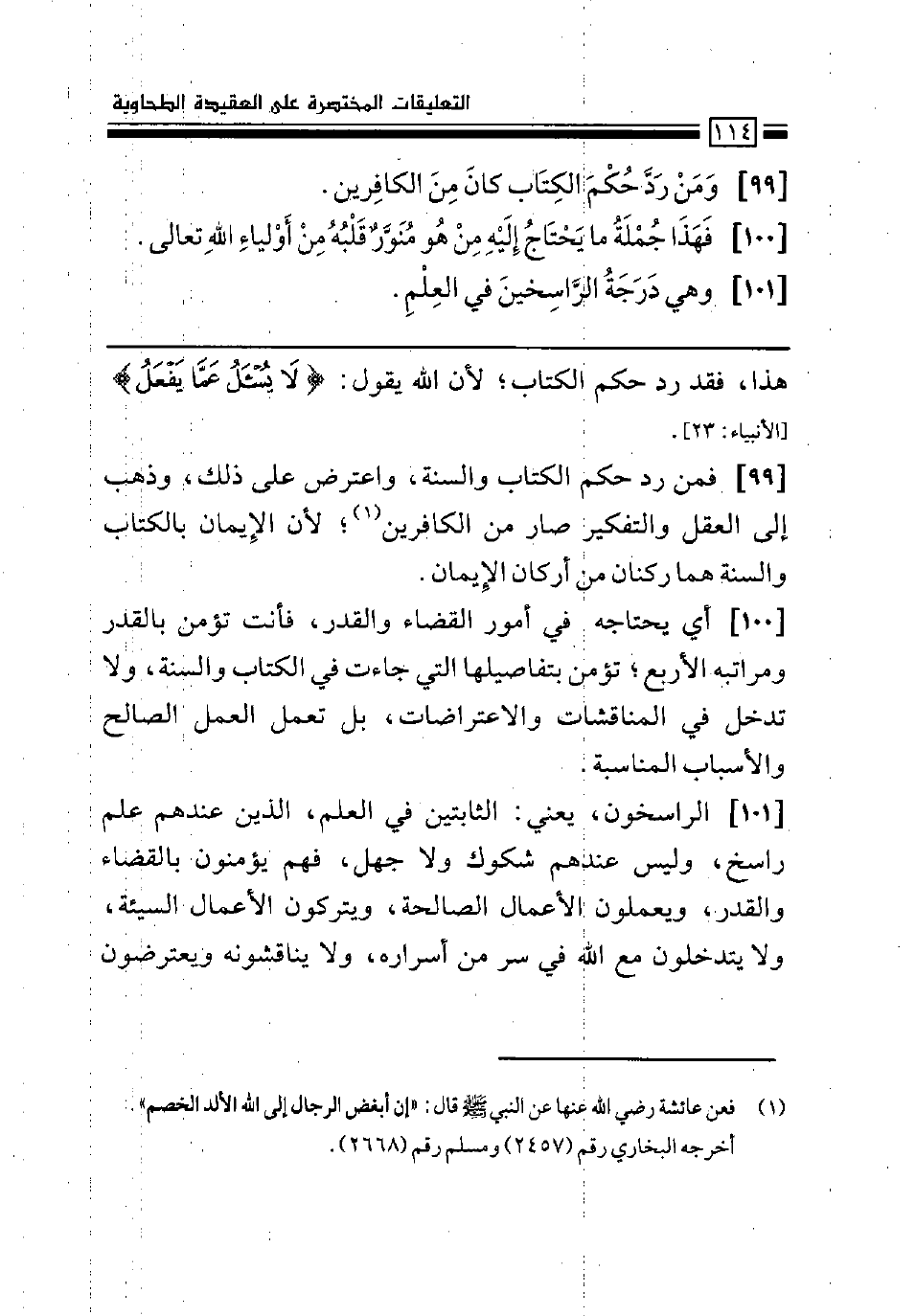 أي يحتاجه في أمور القضاء والقدر، فأنت تؤمن بالقدر ومراتبه الأربع؛ تؤمن بتفاصيلها التي جاءت في الكتاب والسنة، ولا تدخل في المناقشات والاعتراضات، بل تعمل العمل الصالح والأسباب المناسبة.