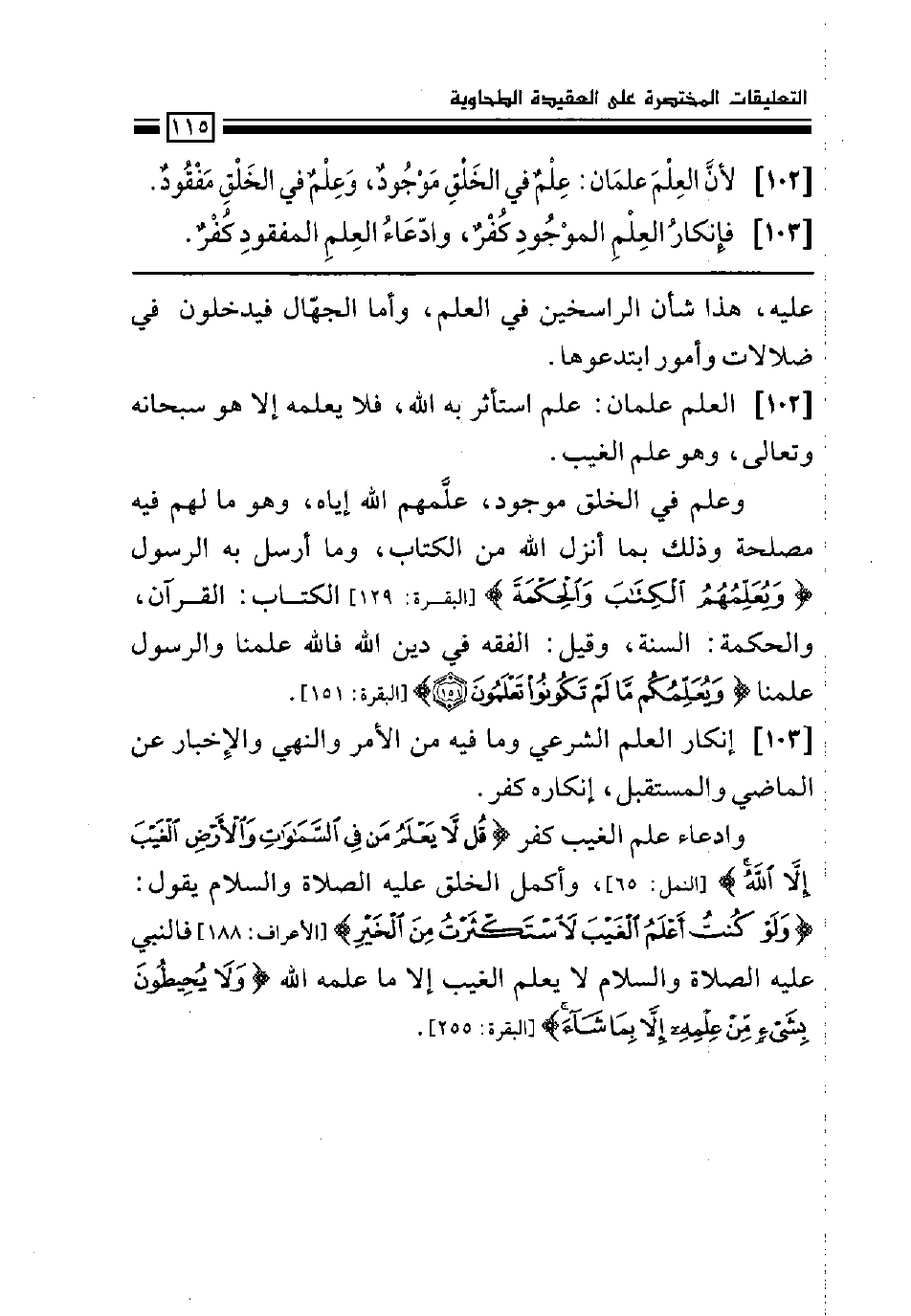 وعلم في الخلق موجود، علّمهم الله إياه، وهو ما لهم فيه مصلحة وذلك بما أنزل الله من الكتاب، وما أرسل به الرسول (ويعلمهم الكتاب والحكمة) [البقر: 129] الكتاب: القرآن، والحكمة: السنة، وقيل: الفقه في دين الله فالله علمنا والرسول علمنا (ويعلمكم ما لم تكونوا تعلمون) [البقر: 151] .