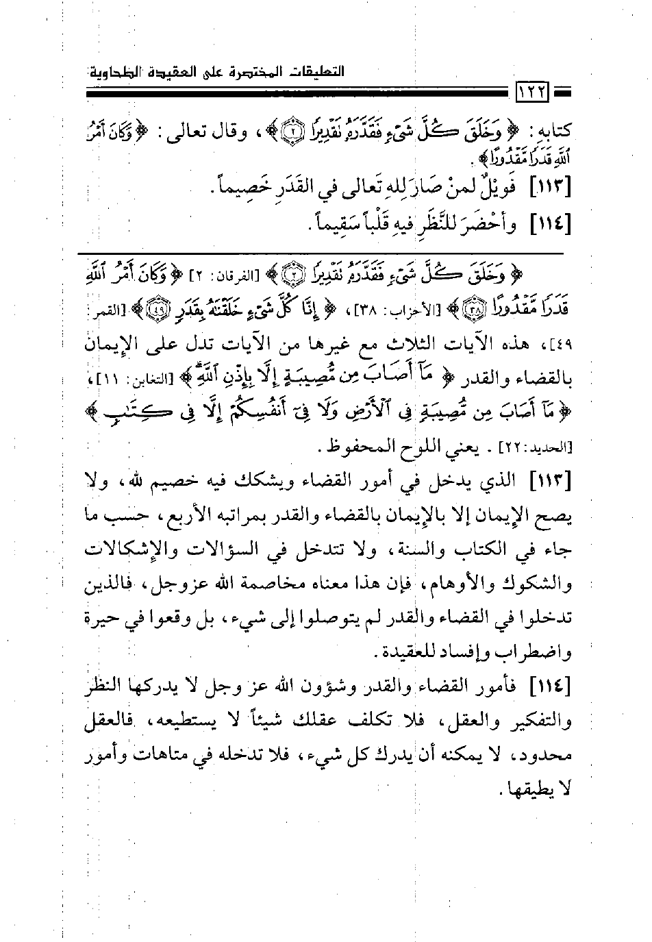 (وخلق كل شيء فقدره تقديراً) [الفرقان: 2] (وكان أمر الله قدراً مقدوراً) [الأحزاب: 38] ، (إنا كل شيء خلقناه بقدر) [القمر: 49] ، هذه الآيات الثلاث مع غيرها من الآيات تدل على الإيمان بالقضاء والقدر (ما أصاب من مصيبة إلا بإذن الله) [التغابن: 11] ، (ما أصاب من مصيبة في الأرض ولا في أنفسكم إلا في كتاب) [الحديد: 22] . يعني اللوح المحفوظ.