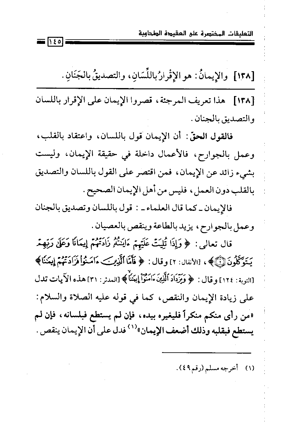 قال تعالى: (وإذا تليت عليهم آياته زادتهم إيماناً وعلى ربهم يتوكلون) [الأنفال: 2] وقال: (فأما الذين آمنوا فزادتهم إيماناً) [التوبة: 124] وقال: (ويزداد الذين آمنوا إيماناً) [المدثر: 31] هذه الآيات تدل على زيادة الإيمان والنقص، كما في قوله عليه الصلاة والسلام: "من رأى منكم منكراً فليغيره بيده، فإن لم يستطع فبلسانه، فإن لم يستطع فبقلبه وذلك أضعف الإيمان" (¬1) فدل على أن الإيمان ينقص.
