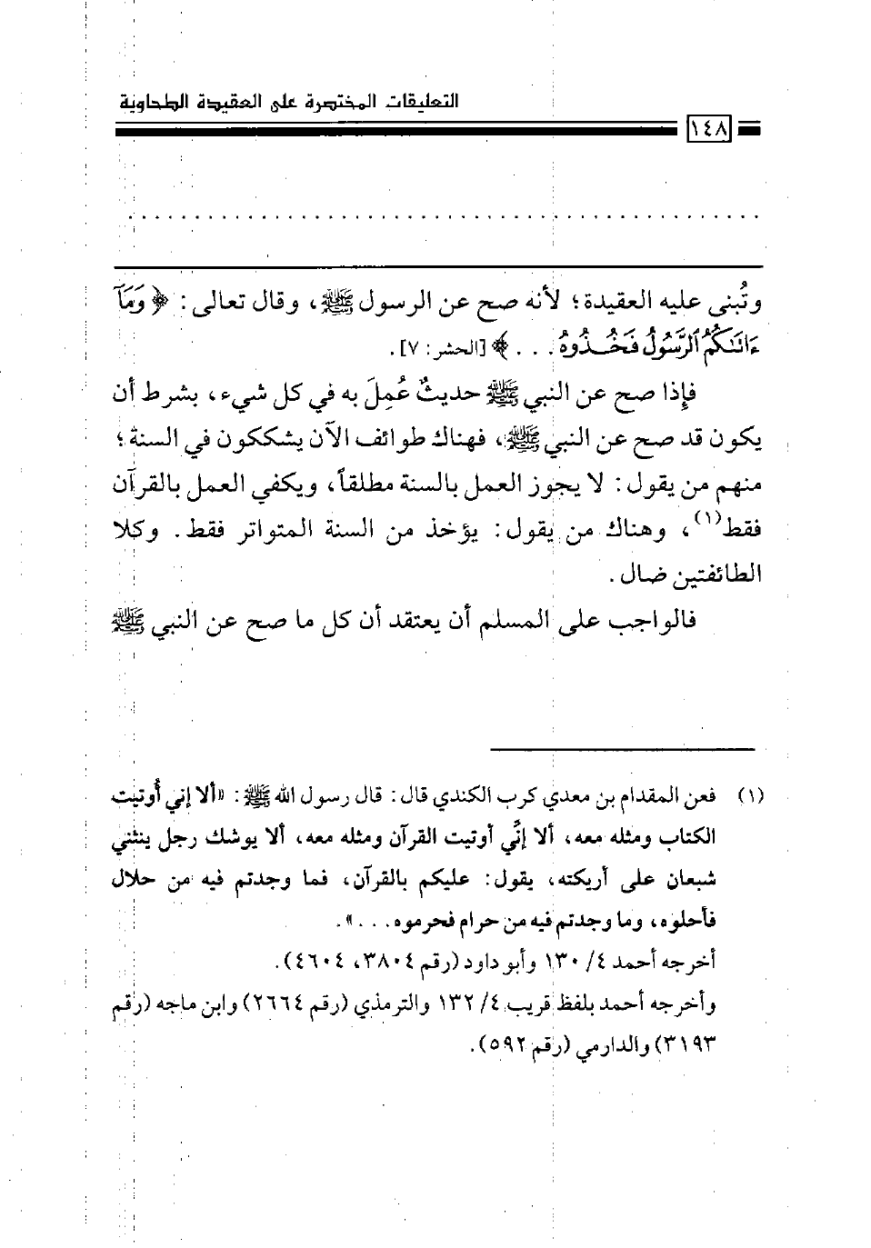 (¬1) فعن المقدام بن معدي كرب الكندي قال: قال رسول الله صلى الله عليه وسلم: "ألا إني أُوتيت الكتاب ومثله معه، ألا إني أوتيت القرآن ومثله معه، ألا يوشك رجل ينثني شبعان على أريكته، يقول: عليكم بالقرآن، فما وجدتم فيه من حلال فأحلوه، وما وجدتم فيه من حرام فحرموه…. ".