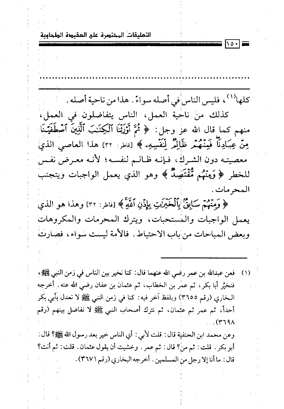كذلك من ناحية العمل، الناس يتفاضلون في العمل، منهم كما قال الله عز وجل: (ثم أورثنا الكتاب الذين اصطفينا من عبادنا فمنهم ظالم لنفسه) [فاطر: 32] هذا العاصي الذي معصيته دون الشرك، فإنه ظالم لنفسه؛ لأنه معرض نفس للخطر (ومنهم مقتصد) وهو الذي يعمل الواجبات ويتجنب المحرمات.