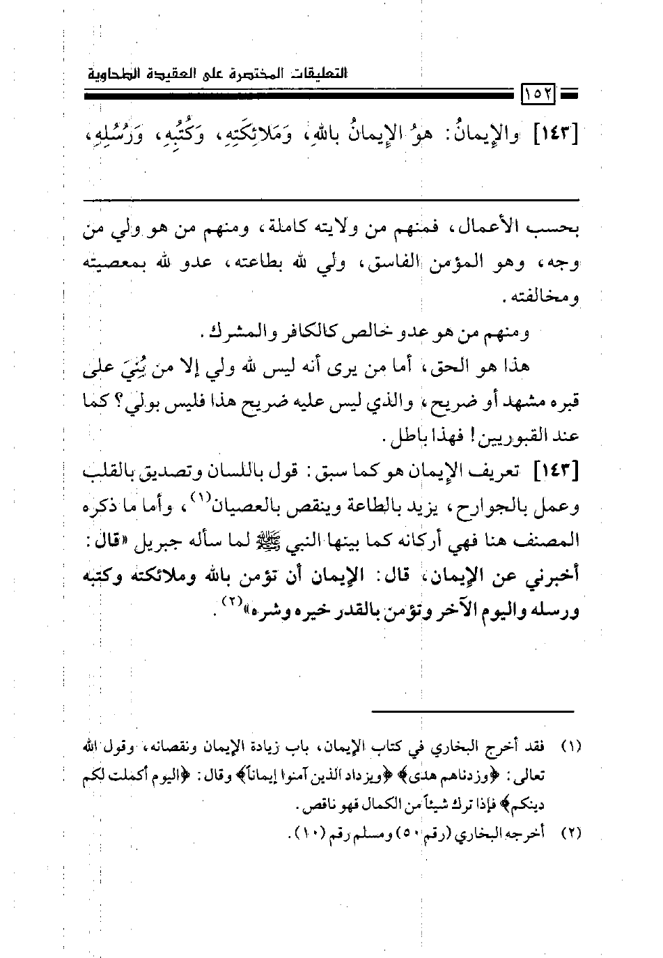 (¬1) فقد أخرج البخاري في كتاب الإيمان، باب زيادة الإيمان ونقصانه، وقول الله تعالى: (وزدناهم هدى) (ويزداد الذين آمنوا إيماناً) وقال: (اليوم أكملت لكم دينكم) فإذا ترك شيئاً من الكمال فهو ناقص.