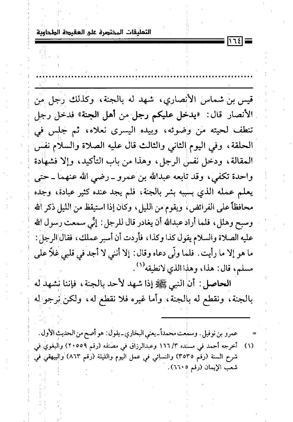 قيس بن شماس الأنصاري، شهد له بالجنة، وكذلك رجل من الأنصار قال: "يدخل عليكم رجل من أهل الجنة" فدخل رجل تنطف لحيته من وضوئه، وبيده اليسرى نعلاه، ثم جلس في الحلقة، وفي اليوم الثاني والثالث قال عليه الصلاة والسلام نفس المقالة، ودخل نفس الرجل، وهذا من باب التأكيد، وإلا فشهادة واحدة تكفي، وقد تابعه عبد الله بن عمرو -رضي الله عنهما- حتى يعلم عمله الذي بسببه بشر بالجنة، فلم يجد عنده كثير عبادة، وجده محافظاً على الفرائض، ويقوم من الليل، وكان إذا استيقظ من الليل ذكر الله وسبح وهلل، فلما أراد عبد الله أن يغادر قال للرجل: إني سمعت رسول الله عليه الصلاة والسلام يقول كذا وكذا، فأردت أن أسبر عملك، فقال الرجل: ما هو إلا ما رأيت. فلما ولىّ دعاه وقال: إلا أنني لا أجد في قلبي غلاً على مسلم، قال: هذا، الذي لا نطيقه (¬1) .