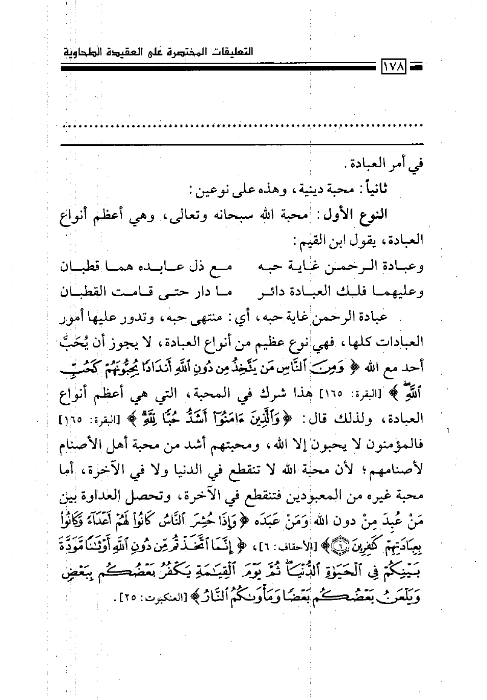 النوع الأول: محبة الله سبحانه وتعالى، وهي أعظم أنواع العبادة، يقول ابن القيم: