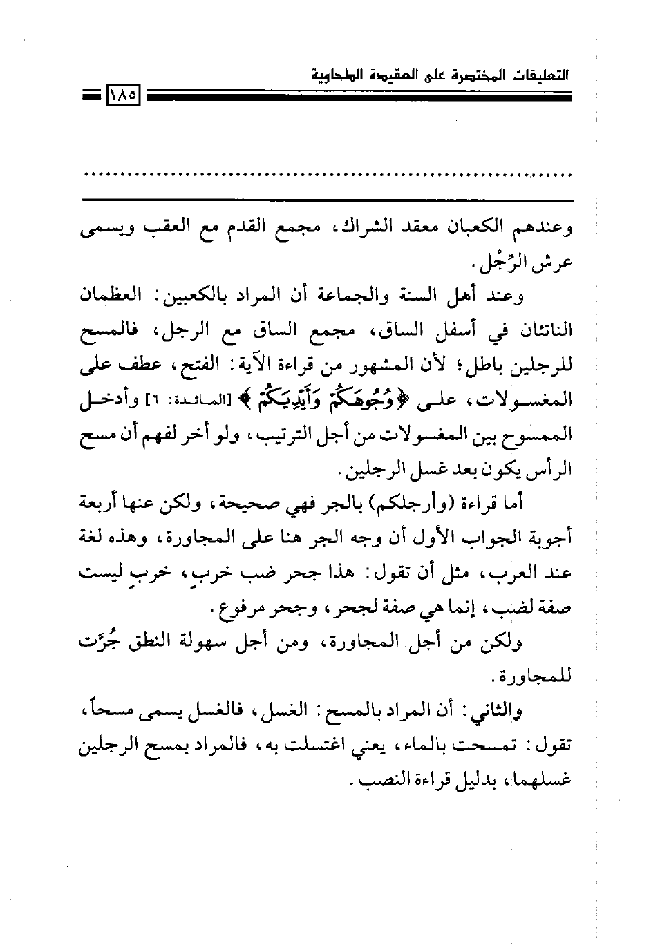 وعند أهل السنة والجماعة أن المراد بالكعبين: العظمان الناتئان في أسفل الساق، مجمع الساق مع الرجل، فالمسح للرجلين باطل؛ لأن المشهور من قراءة الآية: الفتح، عطف على المغسولات، على (وجوهكم وأيديكم) [المائدة: 6] وأدخل الممسوح بين المغسولات من أجل الترتيب، ولو أخر لفهم أن مسح الرأس يكون بعد غسل الرجلين.