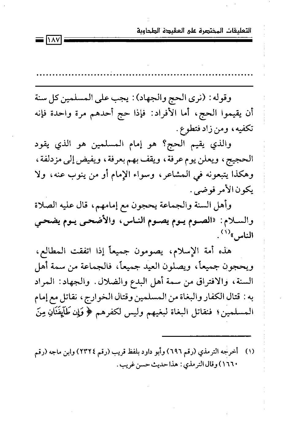 هذه أمة الإسلام، يصومون جمعياً إذا اتفقت المطالع، ويحجون جميعاً، ويصلون العيد جميعاً، فالجماعة من سمة أهل السنة، والافتراق من سمة أهل البدع والضلال. والجهاد: المراد به: قتال الكفار والبغاة من المسلمين وقتال الخوارج، نقاتل مع إمام المسلمين؛ فنقاتل البغاة لبغيهم وليس لكفرهم (وإن طائفتان من
