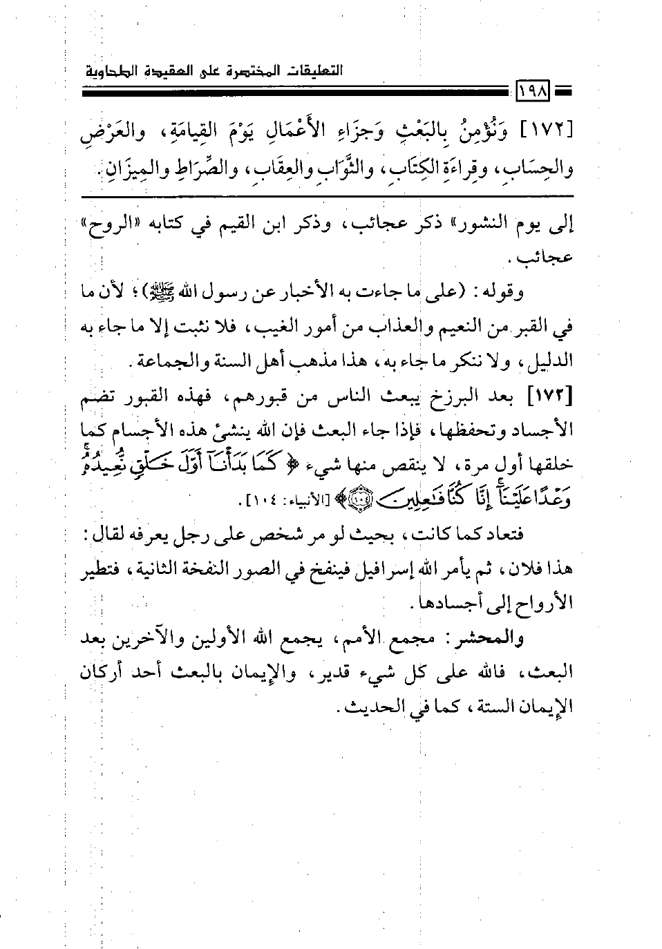 ونؤمن بالبعث وجزاء الأعمال يوم القيامة، والعرض والحساب، وقراءة الكتاب، والثواب والعقاب، والصراط والميزان: