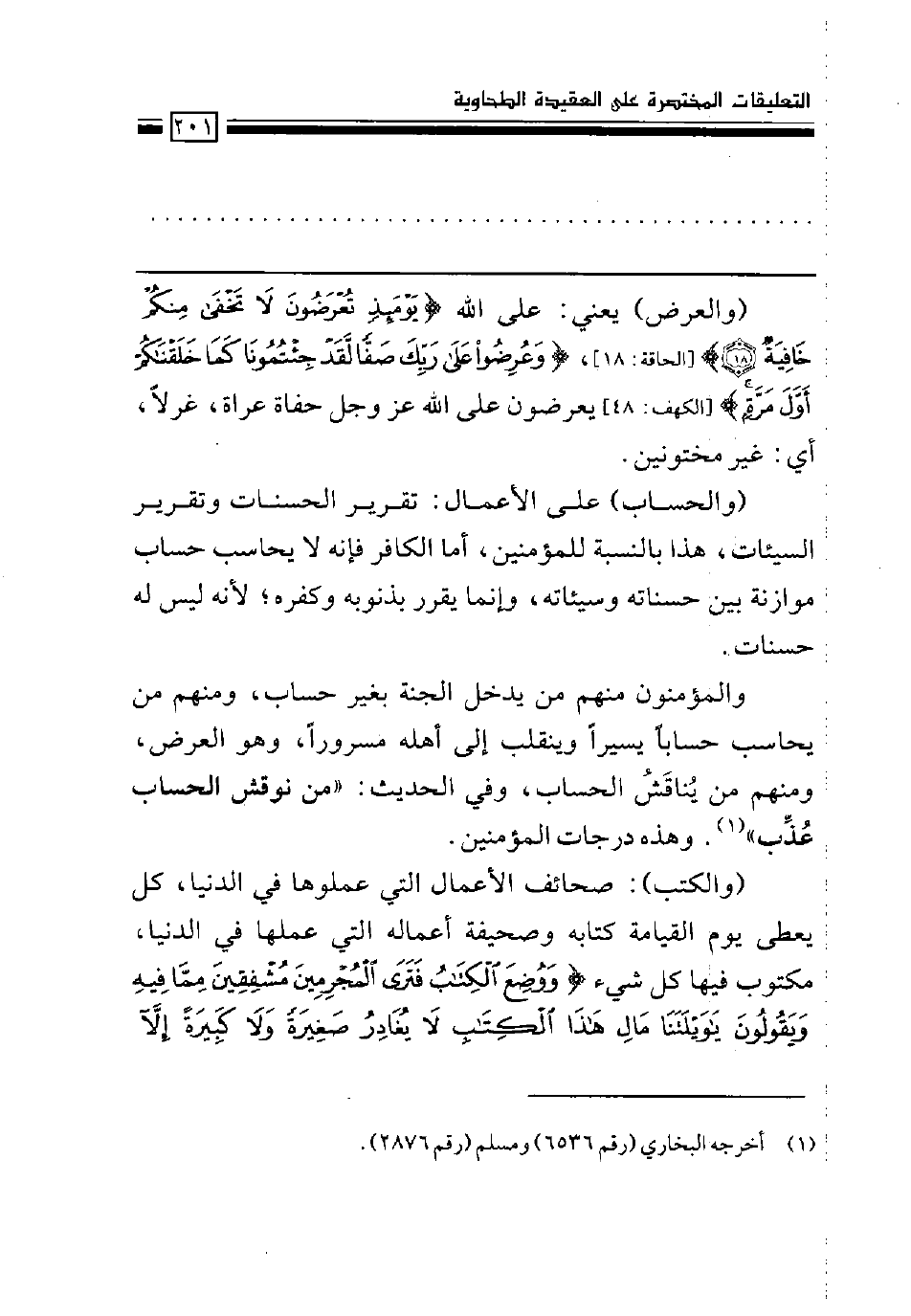 (والحساب) على الأعمال: تقرير الحسنات وتقرير السيئات، هذا بالنسبة للمؤمنين، أما الكافر فإنه لا يحاسب حساب موازنة بين حسناته وسيئاته، وإنما يقرر بذنوبه وكفره؛ لأنه ليس له حسنات.