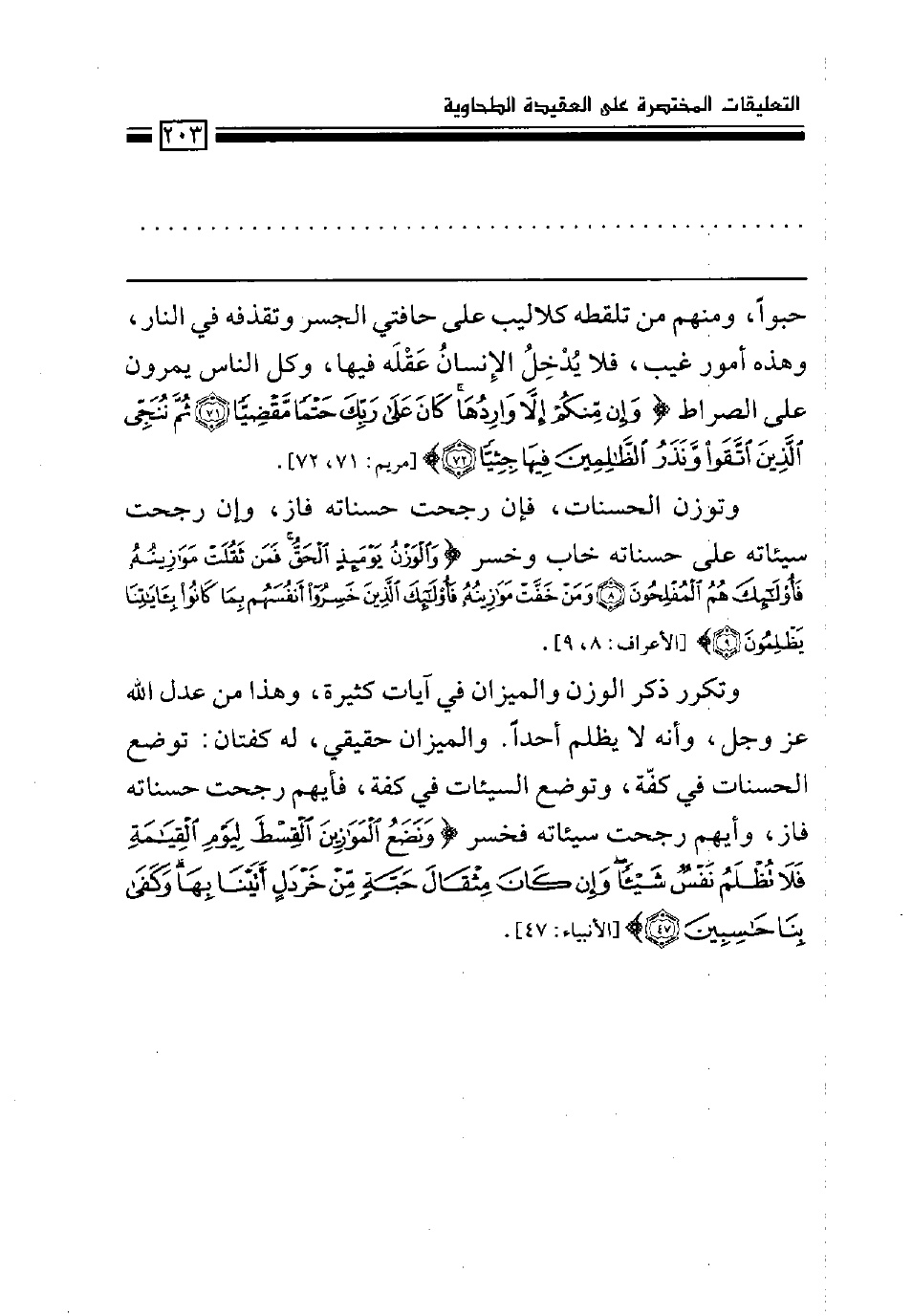 وتكرر ذكر الوزن والميزان في آيات كثيرة، وهذا من عدل الله عز وجل، وأنه لا يظلم أحداً. والميزان حقيقي، له كفتان: توضع الحسنات في كفّه، وتوضع السيئات في كفة، فأيهم رجحت حسناته فاز، وأيهم رجحت سيئاته فخسر (ونضع الموازين القسط ليوم القيامة فلا تظلم نفس شيئاً وإن كان مثقال حبة من خردل أتينا بها وكفى بنا حاسبين) [الأنبياء: 47] .
