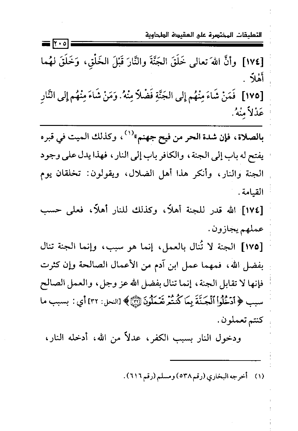 بالصلاة، فإن شدة الحر من فيح جنهم" (¬1) ، وكذلك الميت في قبره يفتح له باب إلى الجنة، والكافر باب إلى النار، فهذا يدل على وجود الجنة والنار، وأنكر هذا أهل الضلال، ويقولون: تخلقان يوم القيامة.