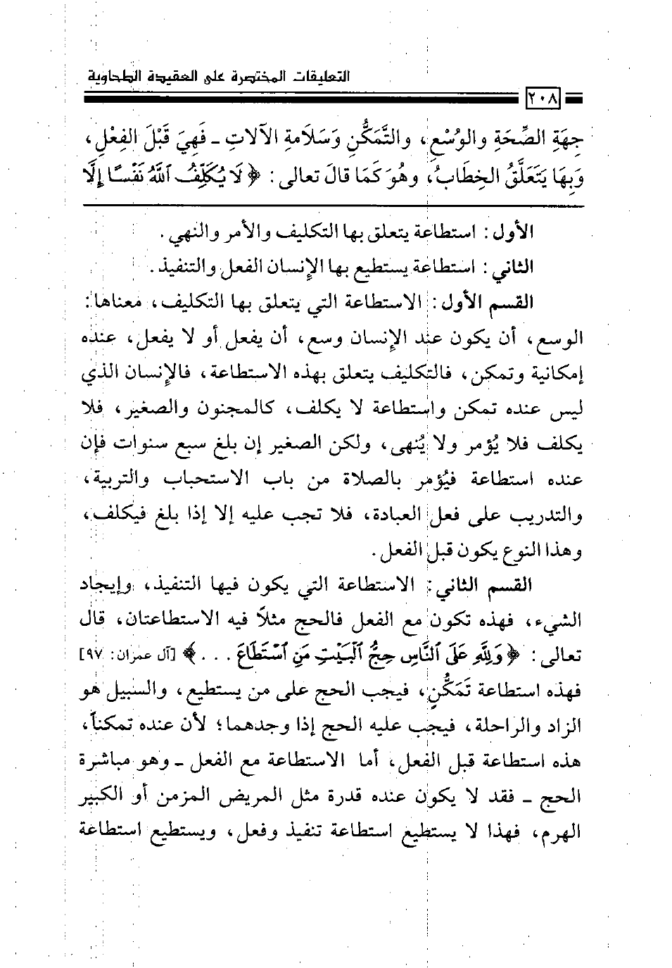 القسم الثاني: الاستطاعة التي يكون فيها التنفيذ، وإيجاد الشيء، فهذه تكون مع الفعل فالحج مثلاً فيه الاستطاعتان، قال تعالى: (ولله على الناس حج البيت من استطاع….) [آل عمران: 97] فهذه استطاعة تمكن، فيجب الحج على من يستطيع، والسبيل هو الزاد والراحلة، فيجب عليه الحج إذا وجدهما؛ لأن عنده تمكناً، هذه استطاعة قبل الفعل، أما الاستطاعة مع الفعل -وهو مباشرة الحج- فقد لا يكون عنده قدرة مثل المريض المزمن أو الكبير الهرم، فهذا لا يستطيع استطاعة تنفيذ وفعل، ويستطيع استطاعة