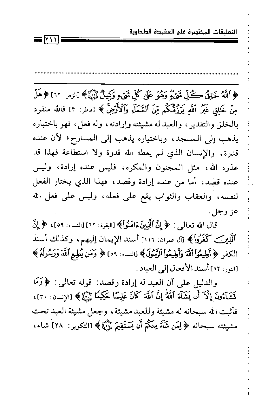 (الله خالق كل شيء وهو على كل شيء وكيل) [الزمر: 62] (هل من خالق غير الله يرزقكم من السماء والأرض) [فاطر: 3] فالله منفرد بالخلق والتقدير، والعبد له مشيئته وإرادته، وله فعل، فهو باختياره يذهب إلى المسجد، وباختياره يذهب إلى المسارح؛ لأن عنده قدرة، والإنسان الذي لم يعطه الله قدرة ولا استطاعة فهذا قد عذره الله، مثل المجنون والمكره، فليس عنده إرادة، وليس عنده قصد، أما من عنده إرادة وقصد، فهذا الذي يختار الفعل لنفسه، والعقاب والثواب يقع على فعله، وليس على فعل الله عز وجل.