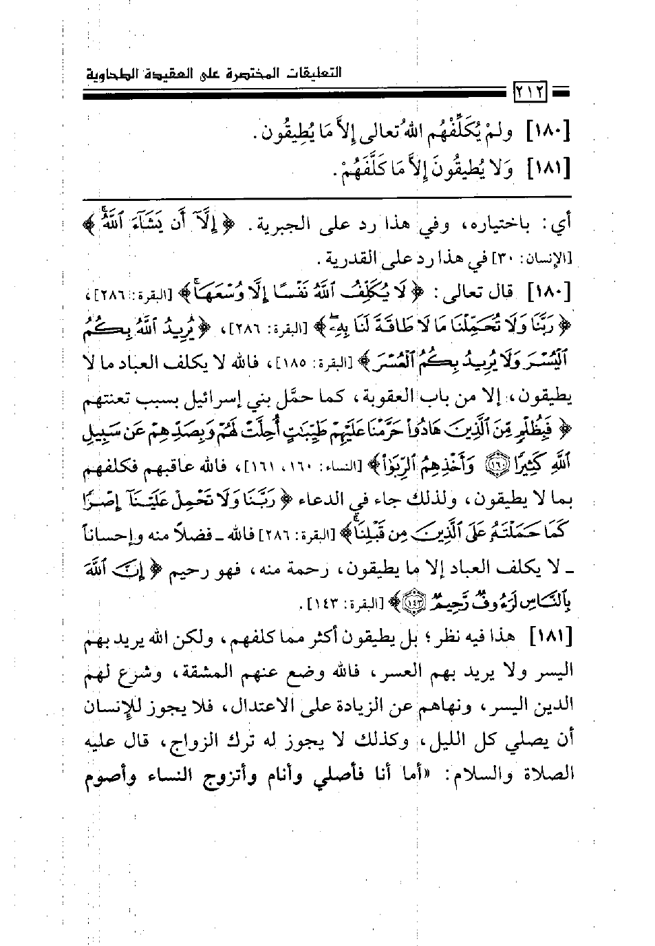 قال تعالى: (لا يكلف الله نفساً إلا وسعها) [البقرة: 286] ، (ربنا ولا تحملنا ما لا طاقة لنا به) [البقرة: 286] ، (يريد الله بكم اليسر ولا يريد بكم العسر) [البقرة: 185] ، فالله لا يكلف العباد ما لا يطيقون، إلا من باب العقوبة، كما حمّل بني إسرائيل بسبب تعنتهم (فبظلم من الذين هادوا حرمنا عليهم طيبات أحلت لهم وبصدهم عن سبيل الله كثيراً* وأخذهم الربا) [النساء: 160، 161] ، فالله عاقبهم فكلفهم بما لا يطيقون، ولذلك جاء في الدعاء (ربنا ولا تحمل علينا إصراً كما حملته على الذين من قبلنا) [البقرة: 286] فالله -فضلاً منه وإحساناً- لا يكلف العباد إلا ما يطيقون، رحمة منه، فهو رحيم (إن الله بالناس لرءوف رحيم) [البقرة: 143] .