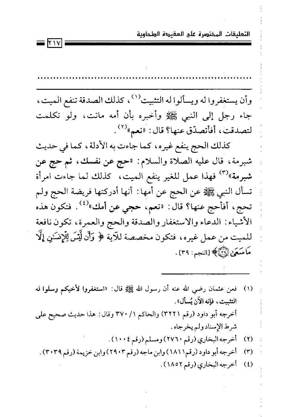 كذلك الحج ينفع غيره، كما جاءت به الأدلة، كما في حديث شبرمة، قال عليه الصلاة والسلام: "حج عن نفسك، ثم حج عن شبرمة" (¬3) فهذا عمل للغير ينفع الميت، كذلك لما جاءت امرأة تسأل النبي صلى الله عليه وسلم عن الحج عن أمها: أنها أدركتها فريضة الحج ولم تحج، أفأحج عنها؟ قال: "نعم، حجي عن أمك" (¬4) . فتكون هذه الأشياء: الدعاء والاستغفار والصدقة والحج والعمرة، تكون نافعة للميت من عمل غيره، فتكون مخصصة للآية (وأن ليس للإنسان إلا ما سعى) [النجم: 39] .