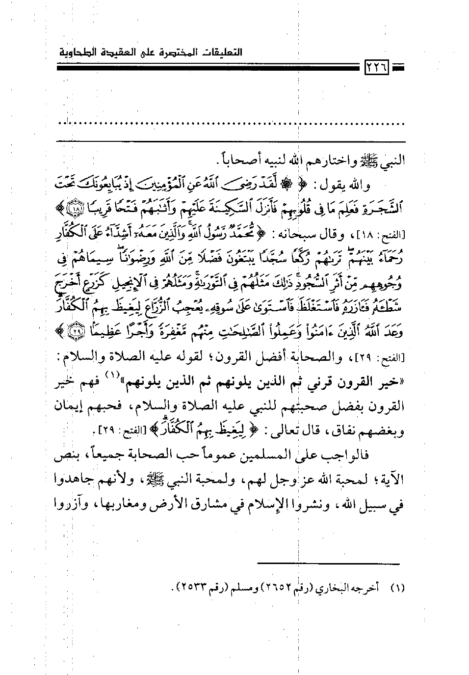 والله يقول: (لقد رضي الله عن المؤمنين إذ يبايعونك تحت الشجرة فعلم ما في قلوبهم فأنزل السكينة عليهم وأثابهم فتحاً قريباً) [الفتح: 18] ، وقال سبحانه: (محمد رسول الله والذين معه أشداء على الكفار رحماء بينهم تراهم ركعاً سجداً يبتغون فضلاً من الله ورضواناً سيماهم في وجههم من أثر السجود ذلك مثلهم في التوراة ومثلهم في الإنجيل كزرع أخرج شطئه فآزره فاستغلظ فاستوى على سوقه يعجب الزراع ليغظ بهم الكفار وعد الله الذي آمنوا وعملوا الصالحات منهم مغفرة وأجراً عظيماً) [الفتح: 29] ، والصحابة أفضل القرون؛ لقوله عليه الصلاة والسلام: "خير القرون قرني ثم الذين يلونهم ثم الذين يلونهم" فهم خير القرون بفضل صحبتهم للنبي عليه الصلاة والسلام، فحبهم إيمان وبغضهم نفاق، قال تعالى: (ليغيظ بهم الكفار) [الفتح: 29] .