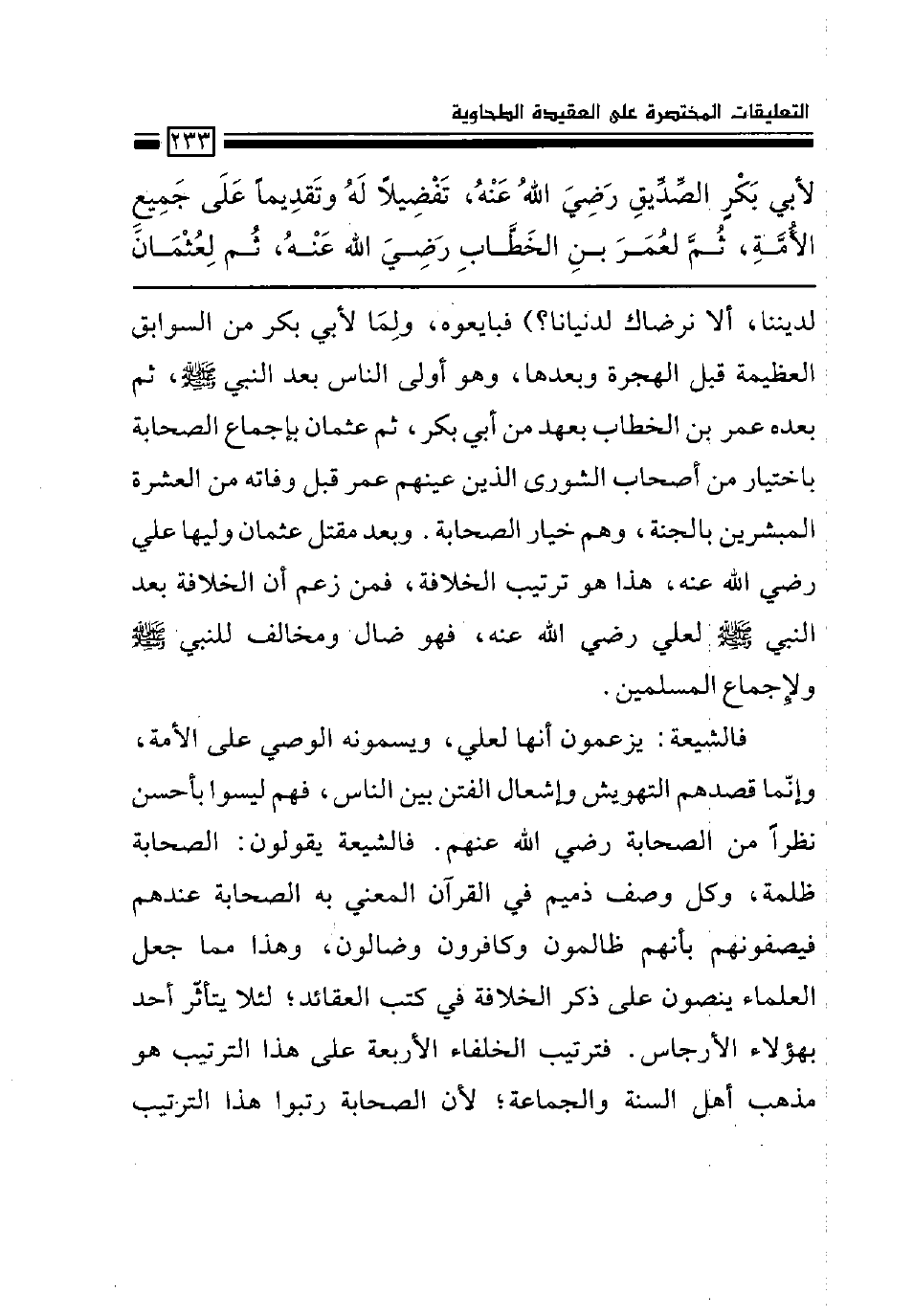 لديننا، ألا نرضاك لدنيانا؟) فبايعوه، ولما لأبي بكر من السوابق العظيمة قبل الهجرة وبعدها، وهو أولى الناس بعد النبي صلى الله عليه وسلم، ثم بعده عمر بن الخطاب بعهد من أبي بكر، ثم عثمان بإجماع الصحابة باختيار من أصحاب الشورى الذين عينهم عمر قبل وفاته من العشرة المبشرين بالجنة، وهم خيار الصحابة. وبعد مقتل عثمان وليها علي رضي الله عنه، هذا هو ترتيب الخلافة، فمن زعم أن الخلافة بعد النبي صلى الله عليه وسلم لعلي رضي الله عنه، فهو ضال ومخالف للنبي صلى الله عليه وسلم ولإجماع المسلمين.