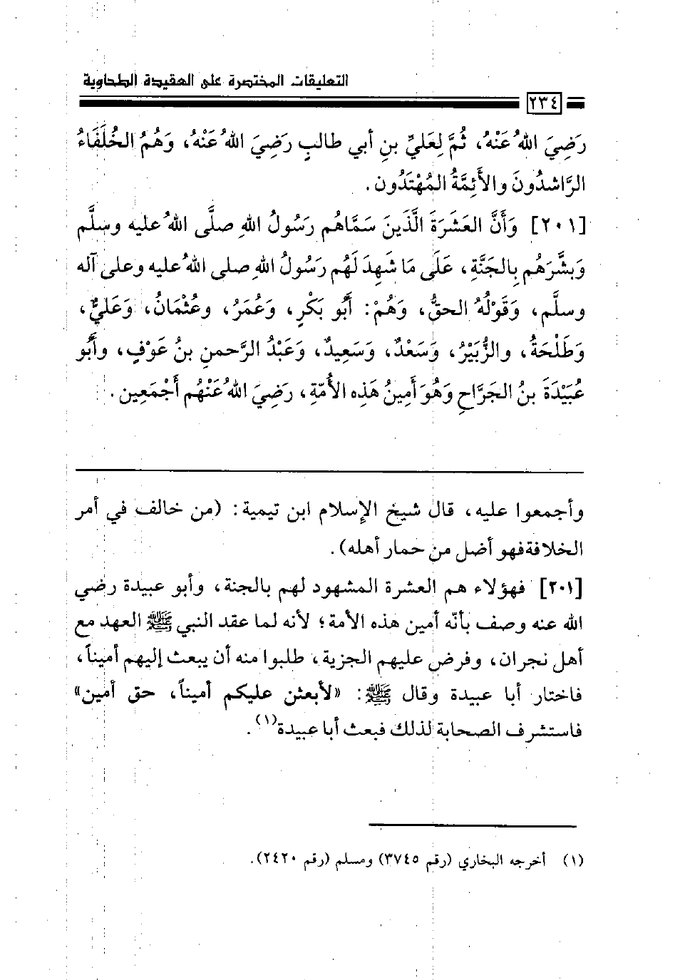 وأن العشرة الذين سماهم رسول الله صلى الله عليه وسلم وبشرهم بالجنة، على ما شهد لهم رسول الله صلى الله عليه وعلى آله وسلم، وقوله الحق، وهم: أبو بكر، وعمر، وعثمان، وعلي، وطلحة، والزبير، وسعد، وسعيد، وعبد الرحمن بن عوف، وأبو عبيدة بن الجراح وهو أمين هذه الأمة، رضي الله عنهم أجمعين:
