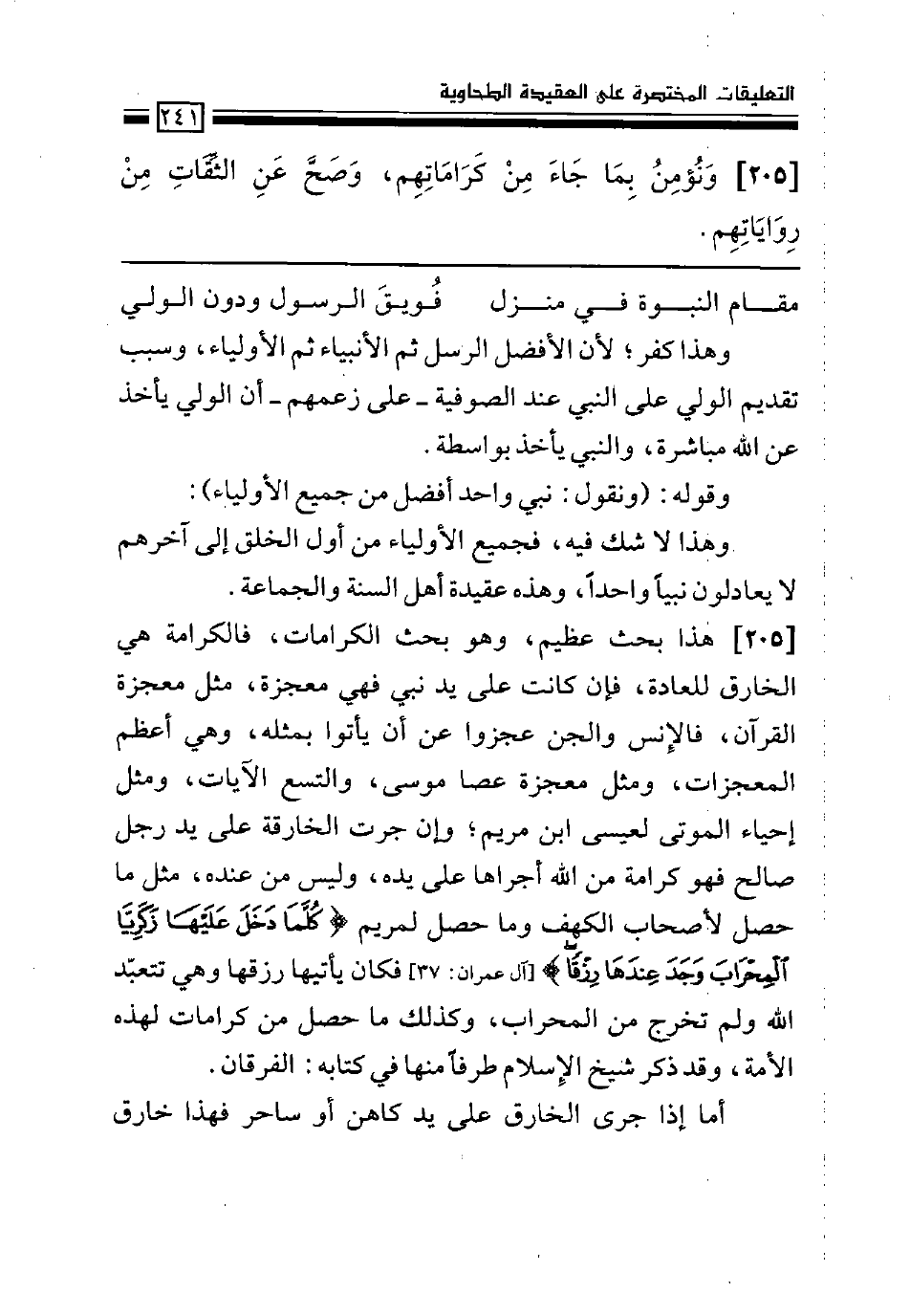 هذا بحث عظيم، وهو بحث الكرامات، فالكرامة هي الخارق للعادة، فإن كانت على يد نبي فهي معجزة، مثل معجزة القرآن، فالإنس والجن عجزوا عن أن يأتوا بمثله، وهي أعظم المعجزات، ومثل معجزة عصا موسى، والتسع الآيات، ومثل إحياء الموتى لعيسى ابن مريم؛ وإن جرت الخارقة على يد رجل صالح فهو كرامة من الله أجراها على يده، وليس من عنده، مثل ما حصل لأصحاب الكهف وما حصل لمريم (كلما دخل عليها زكريا المحراب وجد عندها رزقاً) [آل عمران: 37] فكان يأتيها رزقها وهي تتعبّد الله ولم تخرج من المحراب، وكذلك ما حصل من كرامات لهذه الأمة، وقد ذكر شيخ الإسلام طرفاً منها في كتابه: الفرقان.