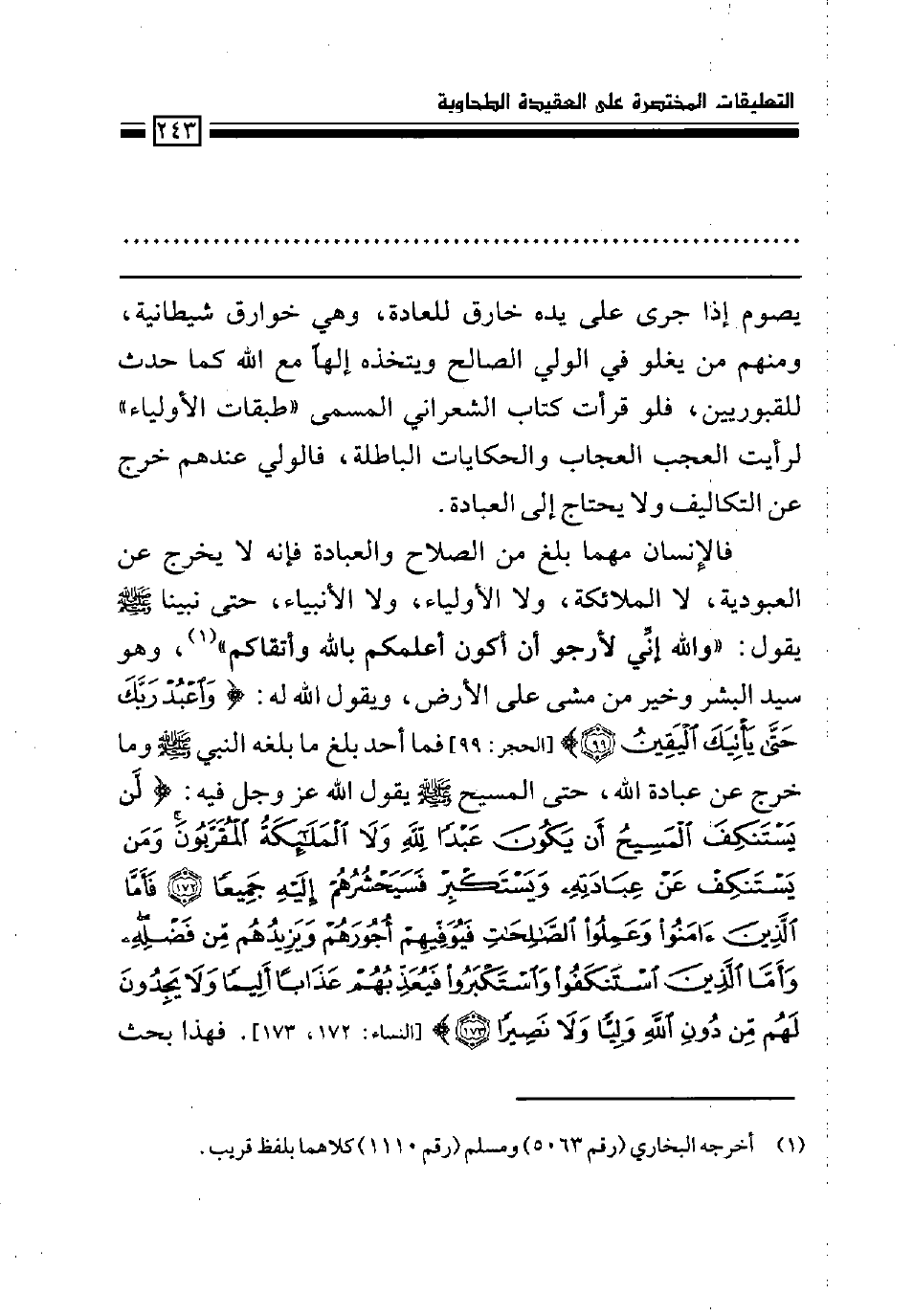فالإنسان مهما بلغ من الصلاح والعبادة فإنه لا يخرج عن العبودية، لا الملائكة، ولا الأولياء، ولا الأنبياء، حتى نبينا صلى الله عليه وسلم يقول: "والله إني لأرجو أن أكون أعلمكم بالله وأتقاكم"، وهو سيد البشر وخير من مشى على الأرض، ويقول الله له: (واعبد ربك حتى يأتيك اليقين) [الحجر: 99] فما أحد بلغ ما بلغه النبي صلى الله عليه وسلم وما خرج عن عبادة الله، حتى المسيح صلى الله عليه وسلم يقول الله عز وجل فيه: (لن يستنكف المسيح أن يكون عبداً لله ولا الملائكة المقربون ومن يستنكف عن عبادته ويستكبر فسيحشرهم إليه جميعاً* فأما الذين آمنوا وعملوا الصالحات فيوفيهم أجورهم ويزيدهم من فضله وأما الذين استنكفوا واستكبروا فيعذبهم عذاباً أليماً ولا يجدون لهم من دون الله ولياً ولا نصيراً) [النساء: 172، 173] فهذا بحث