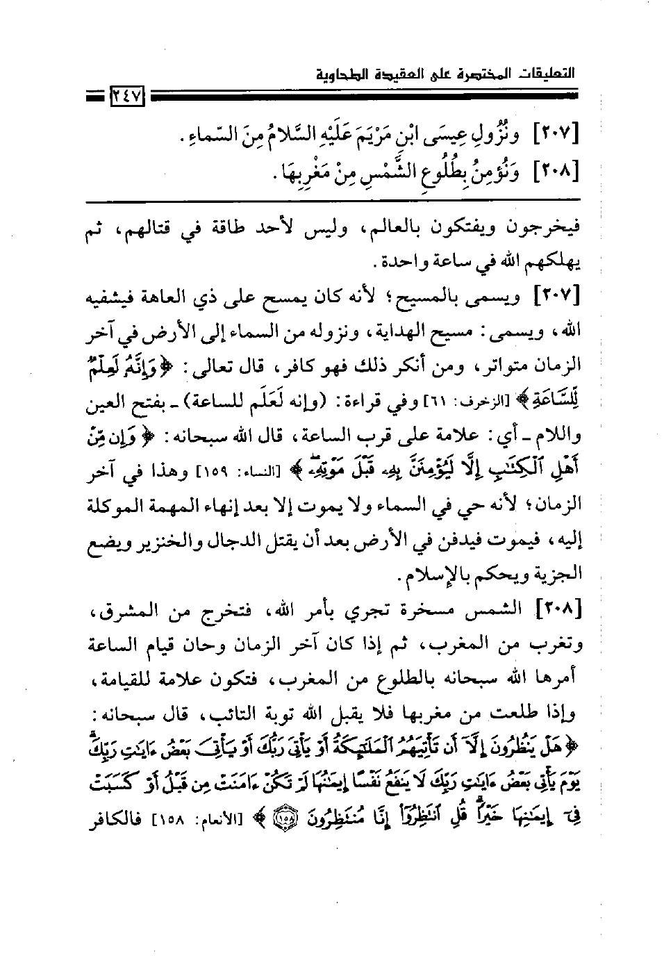 ويسمى بالمسيح؛ لأنه كان يمسح على ذي العاهة فيشفيه الله، ويسمى: مسيح الهداية، ونزوله من السماء إلى الأرض في آخر الزمان متواتر، ومن أنكر ذلك فهو كافر، قال تعالى: (وإنه لعلم للساعة) [الزخرف: 61] وفي قراءة: (وإنه لعلم للساعة) -بفتح العين واللام- أي: علامة على قرب الساعة، قال الله سبحانه: (وإن من أهل الكتاب إلا ليؤمنن به قبل موته) [النساء: 159] وهذا في آخر الزمان؛ لأنه حي في السماء ولا يموت إلا بعد إنهاء المهمة الموكلة إليه، فيموت فيدفن في الأرض بعد أن يقتل الدجال والخنزير ويضع الجزية ويحكم بالإسلام.