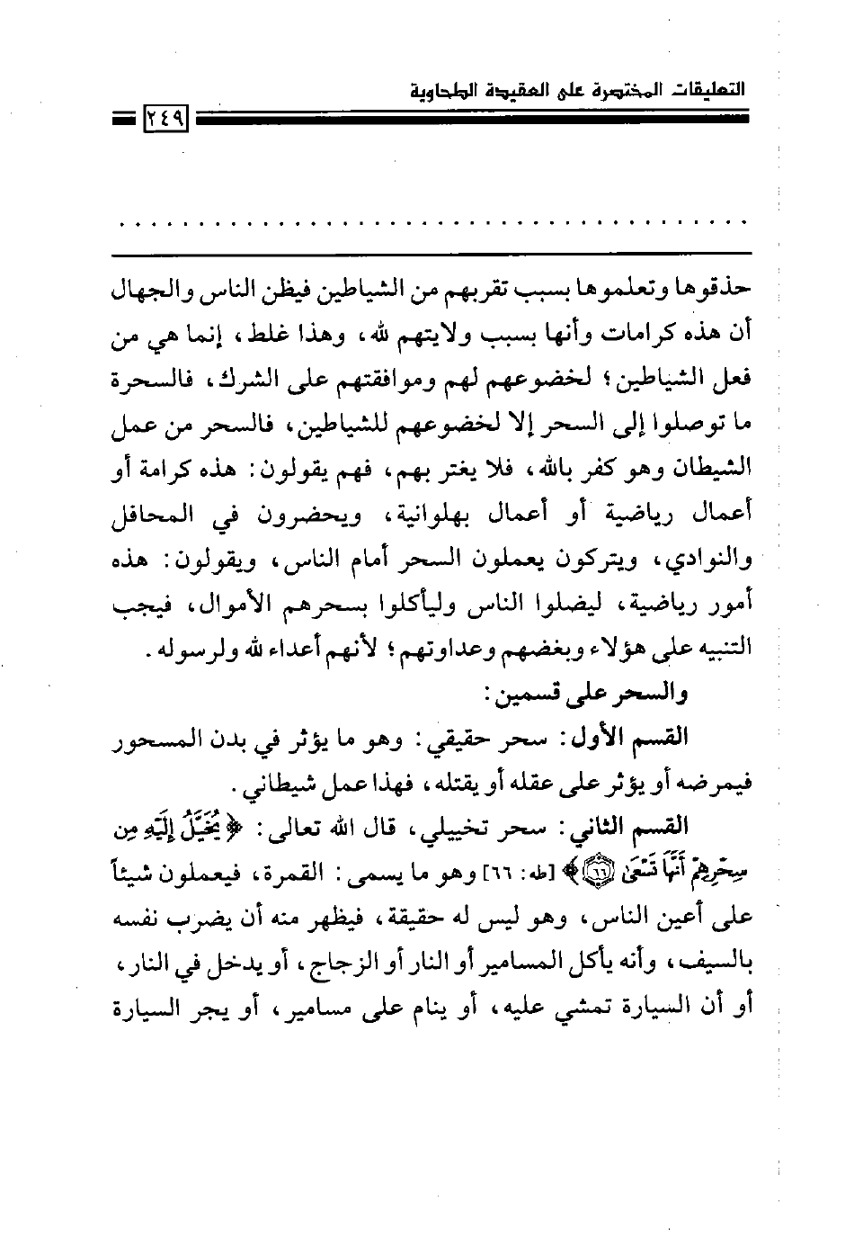 القسم الثاني: سحر تخييلي، قال الله تعالى: (يخيل إليه من سحرهم أنها تسعى) [طه: 66] وهو ما يسمى: القمرة، فيعملون شيئاً على أعين الناس، وهو ليس له حقيقة، فيظهر منه أن يضرب نفسه بالسيف، وأنه يأكل المسامير أو النار أو الزجاج، أو يدخل في النار، أو أن السيارة تمشي عليه، أو ينام على مسامير، أو يجر السيارة
