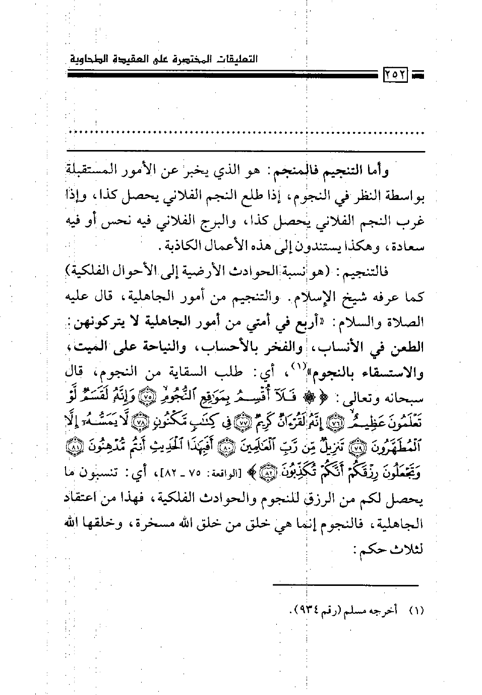 فالتنجيم: (هو نسبة الحوادث الأرضية إلى الأحوال الفلكية) كما عرفه شيخ الإسلام. والتنجيم من أمور الجاهلية، قال عليه الصلاة والسلام: "أربع في أمتي من أمور الجاهلية لا يتركونهن: الطعن في الأنساب، والفخر بالأحساب، والنياحة على الميت، والاستسقاء بالنجوم" (¬1) ، أي: طلب السقاية من النجوم، قال سبحانه وتعالى: (فلا أقسم بمواقع النجوم* وإنه لقسم لو تعلمون عظيم* إنه لقرآن كريم في كتاب مكنون* لا يمسه إلا المطهرون* تنزيل من رب العالمين* أفبهذا الحديث أنتم مدهنون* وتجعلون رزقكم أنكم تكذبون) [الواقعة: 75، 82] ، أي: تنسبون ما يحصل لكم من الرزق للنجوم والحوادث الفلكية، فهذا من اعتقاد الجاهلية، فالنجوم إنما هي خلق من خلق الله مسخرة، وخلقها الله لثلاث حكم: