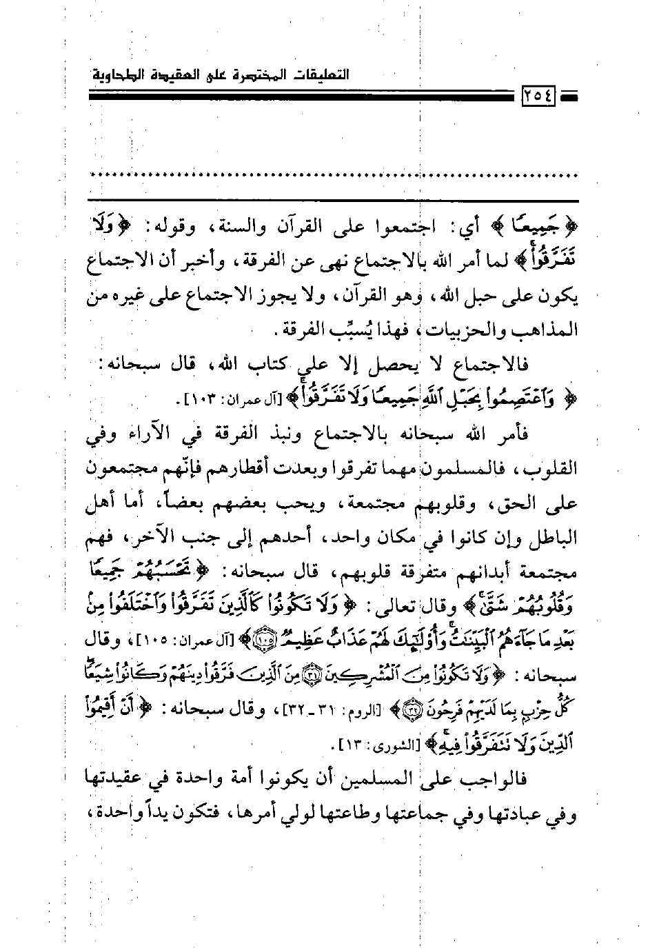 (جميعاً) أي: اجتمعوا على القرآن والسنة، وقوله: (ولا تفرقوا) لما أمر الله بالاجتماع نهى عن الفرقة، وأخبر أن الاجتماع يكون على حبل الله، وهو القرآن، ولا يجوز الاجتماع على غيره من المذاهب والحزبيات، فهذا يُسبب الفرقة.
