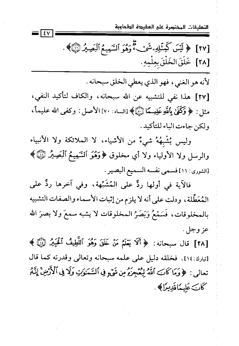 وليس يشبهه شيء من الأشياء، لا الملائكة ولا الأنبياء والرسل ولا الأولياء ولا أي مخلوق (وهو السميع البصير) [الشورى: 11] فسمى نفسه السميع البصير.