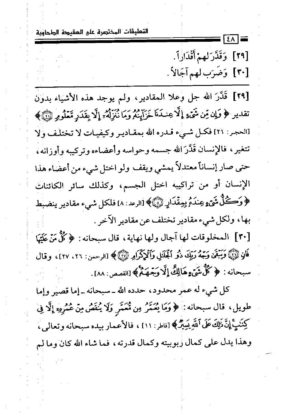 قدر الله جل وعلا المقادير، ولم يوجد هذه الأشياء بدون تقدير (وإن من شيء إلا عندنا خزائنه وما ننزله إلا بقدر معلوم) [الحجر: 21] فكل شيء قدره الله بمقادير وكيفيات لا تختلف ولا تتغير، فالإنسان قدر الله جسمه وحواسه وأعضاءه وتركيبه وأوزانه، حتى صار إنساناً معتدلاً يمشي ويقف ولو اختل شيء من أعضاء هذا الإنسان أو من تراكيبه اختل الجسم، وكذلك سائر الكائنات (وكل شيء عنده بمقدار) [الرعد: 8] فلكل شيء مقادير ينضبط بها، ولكل شيء مقادير تختلف عن مقادير الآخر.