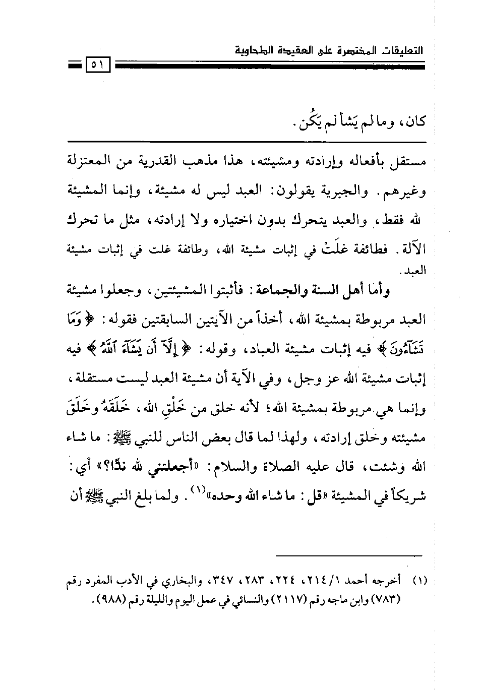 مستقل بأفعاله وإرادته ومشيئته، هذا مذهب القدرية من المعتزلة وغيرهم. والجبرية يقولون: العبد ليس له مشيئة، وإنما المشيئة لله فقط، والعبد يتحرك بدون اختياره ولا إرادته، مثل ما تحرك الآلة. فطائفة غلت في إثبات مشيئة الله وطائفة غلت في إثبات مشيئة العبد.