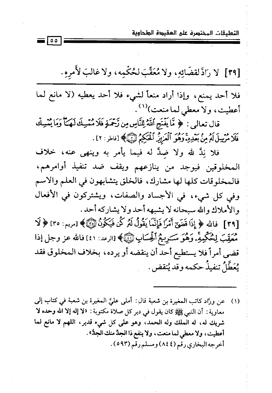 (¬1) عن ورّاد كاتب المغيرة بن شعبة قال: أملى عليّ المغيرة بن شعبة في كتاب إلى معاوية: أن النبي صلى الله عليه وسلم كان يقول في دبر كل صلاة مكتوبة: "لا إله إلا الله وحده لا شريك له، له الملك وله الحمد، وهو على كل شيء قدير، اللهم لا مانع لما أعطيت، ولا معطي لما منعت، ولا ينفع ذا الجد منك الجد".
