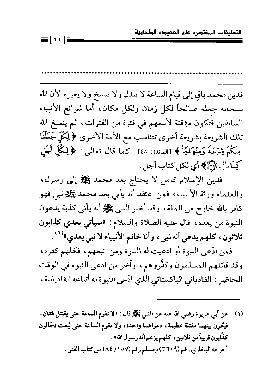 (¬1) عن أبي هريرة رضي الله عنه عن النبي صلى الله عليه وسلم قال: "لا تقوم الساعة حتى يقتتل فئتان، فيكون بينهما مقتلة عظيمة، دعواهما واحدة، ولا تقوم الساعة حتى يُبعث دجّالون كذّابون قريباً من ثلاثين، كلهم يزعم أنه رسول الله ".