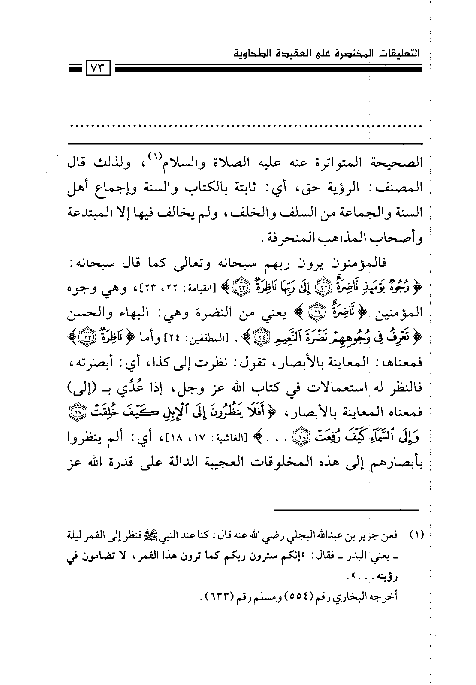 (¬1) فعن جرير بن عبد الله البجلي رضي الله عنه قال: كنا عند النبي صلى الله عليه وسلم فنظر إلى القمر ليلة -يعني البدر- فقال: "إنكم سترون ربكم كما ترون هذا القمر، لا تضامون في رؤيته…".