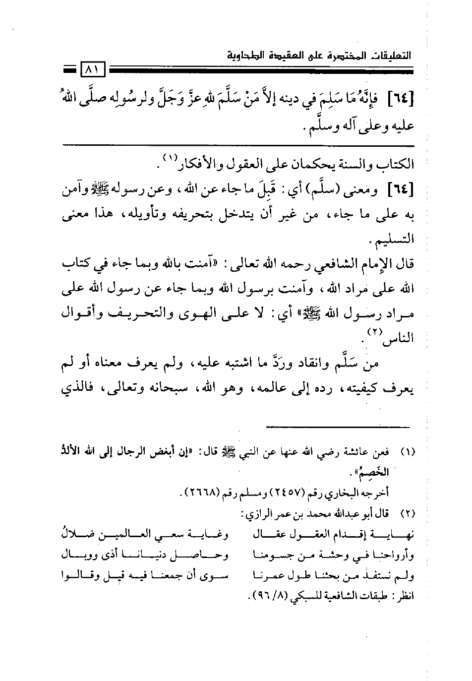 قال الإمام الشافعي رحمه الله تعالى: "آمنت بالله وبما جاء في كتاب الله على مراد الله، وآمنت برسول الله وبما جاء عن رسول الله على مراد رسول الله صلى الله عليه وسلم" أي: لا على الهوى والتحريف وأقوال الناس (¬2) .