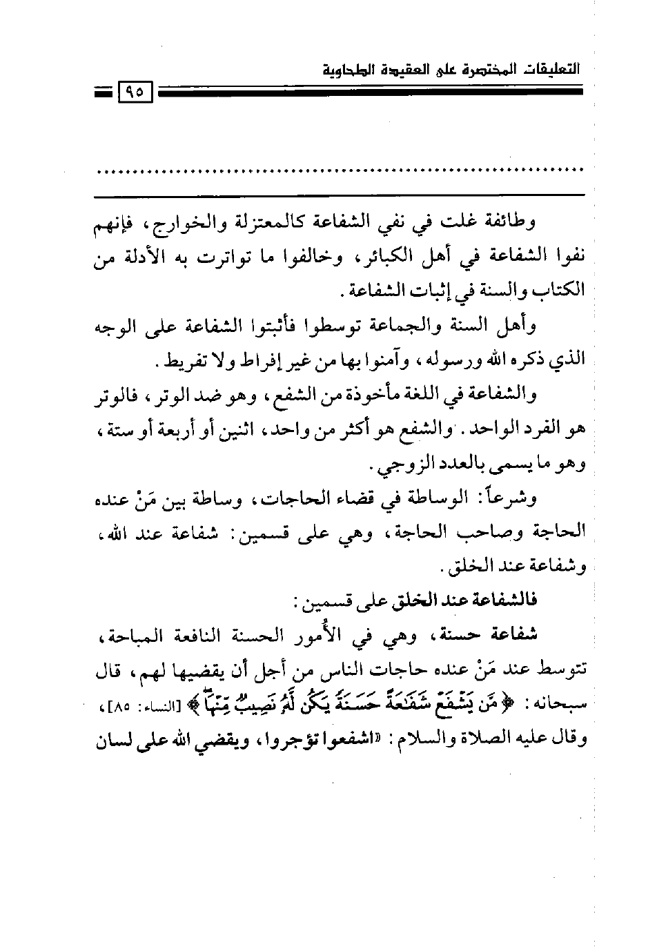 وطائفة غلت في نفي الشفاعة كالمعتزلة والخوارج، فإنهم نفوا الشفاعة في أهل الكبائر، وخالفوا ما تواترت به الأدلة من الكتاب والسنة في إثبات الشفاعة.