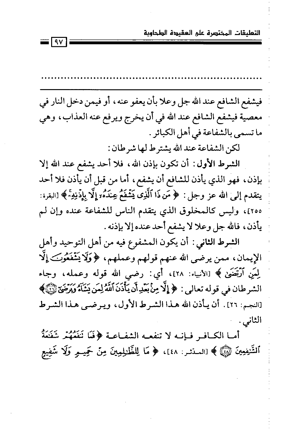 الشرط الثاني: أن يكون المشفوع فيه من أهل التوحيد وأهل الإيمان، ممن يرضى الله عنهم قولهم وعملهم، (ولا يشفعون إلا لمن ارتضى) [الأنبياء: 28] ، أي: رضي الله قوله وعمله، وجاء الشرطان في قوله تعالى: (إلا من بعد أن يأذن الله لمن يشاء ويرضى) [النجم: 26] . أن يأذن الله هذا الشرط الأول، ويرضى هذا الشرط الثاني.