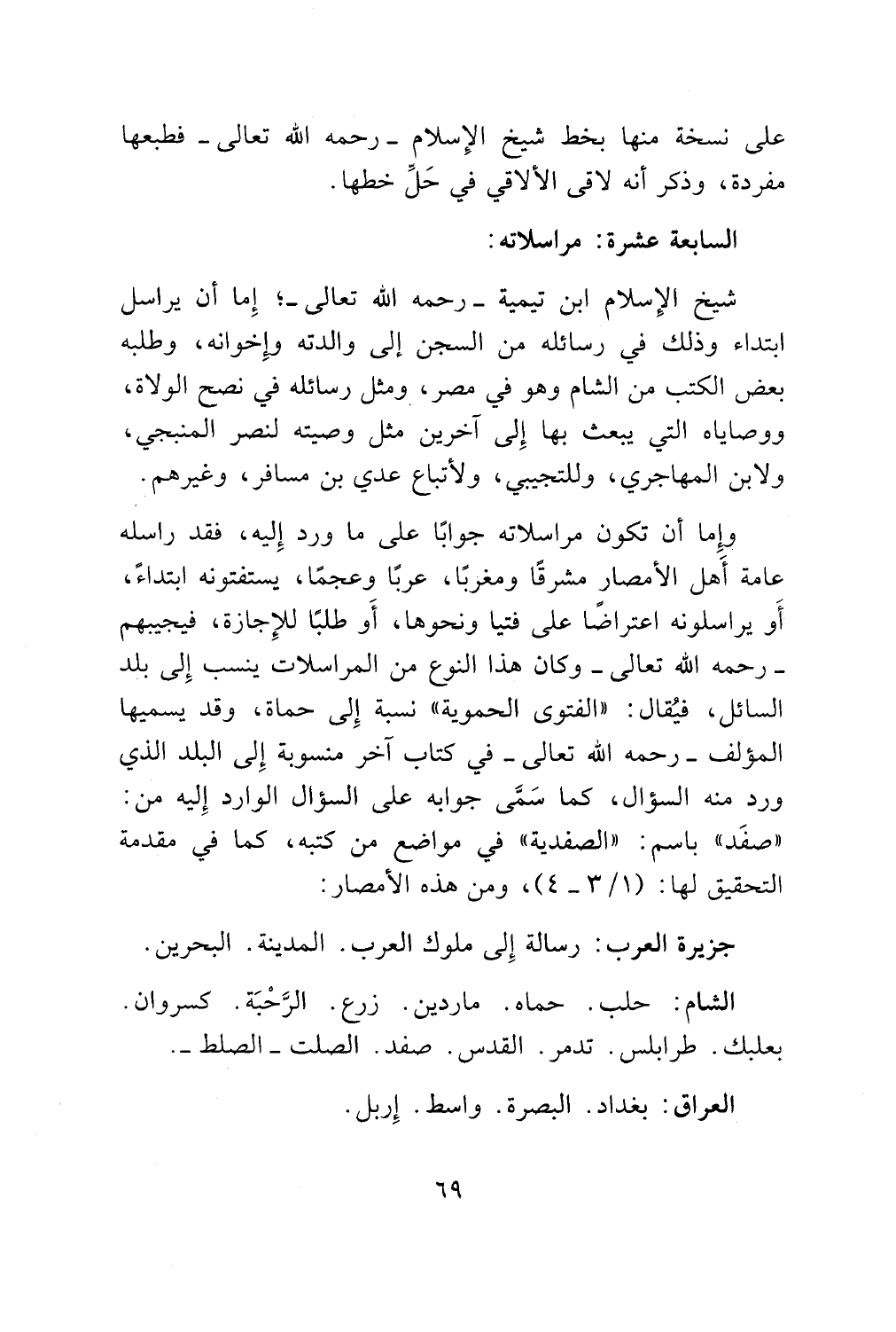 على نسخة منها بخط شيخ الإسلام -رحمه الله تعالى - فطبعها